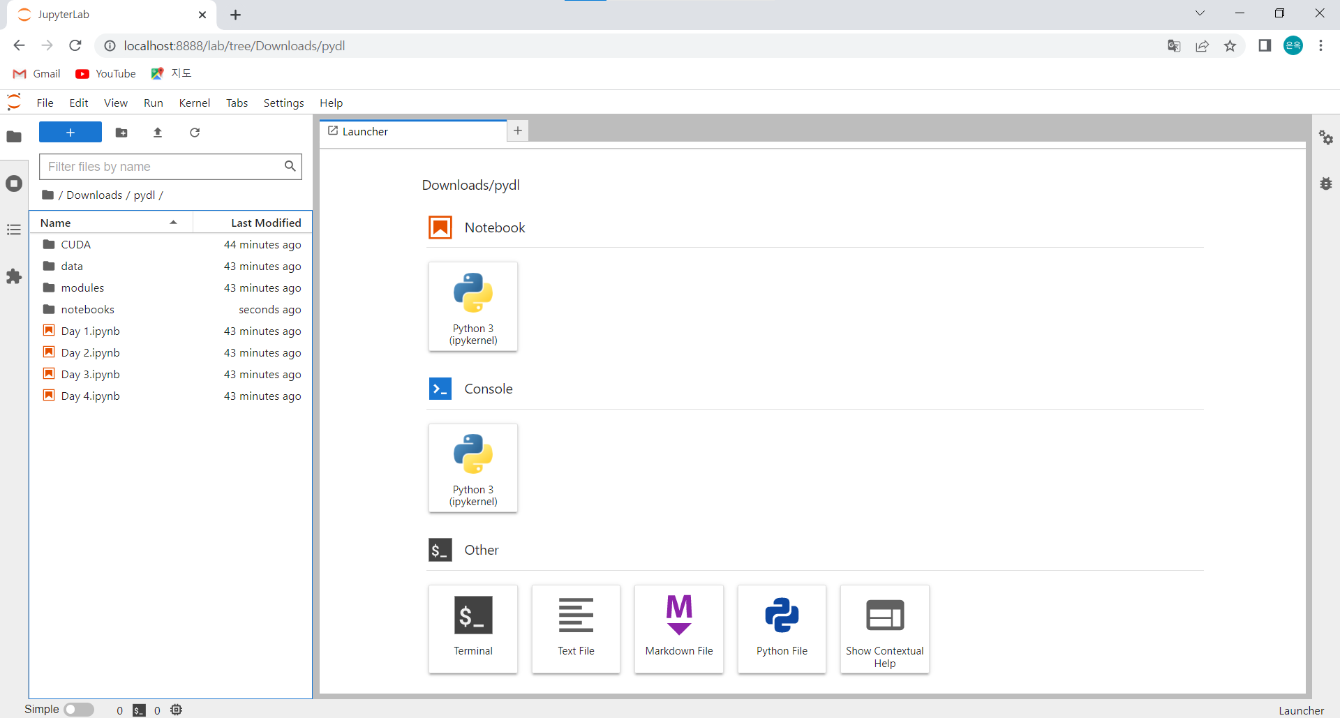 아래와 같이 JupyterLab이 실행된 것을 확인할 수 있습니다.