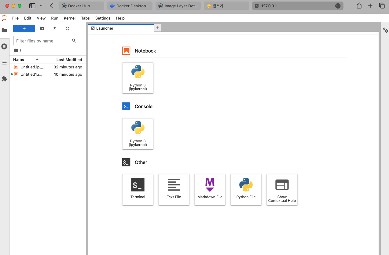 짜잔! 컨테이너에 실행시켜보니 URL을 제공해주는데 클릭해보면 Jupyterlab이 실행된 것을 확인할 수 있습니다.