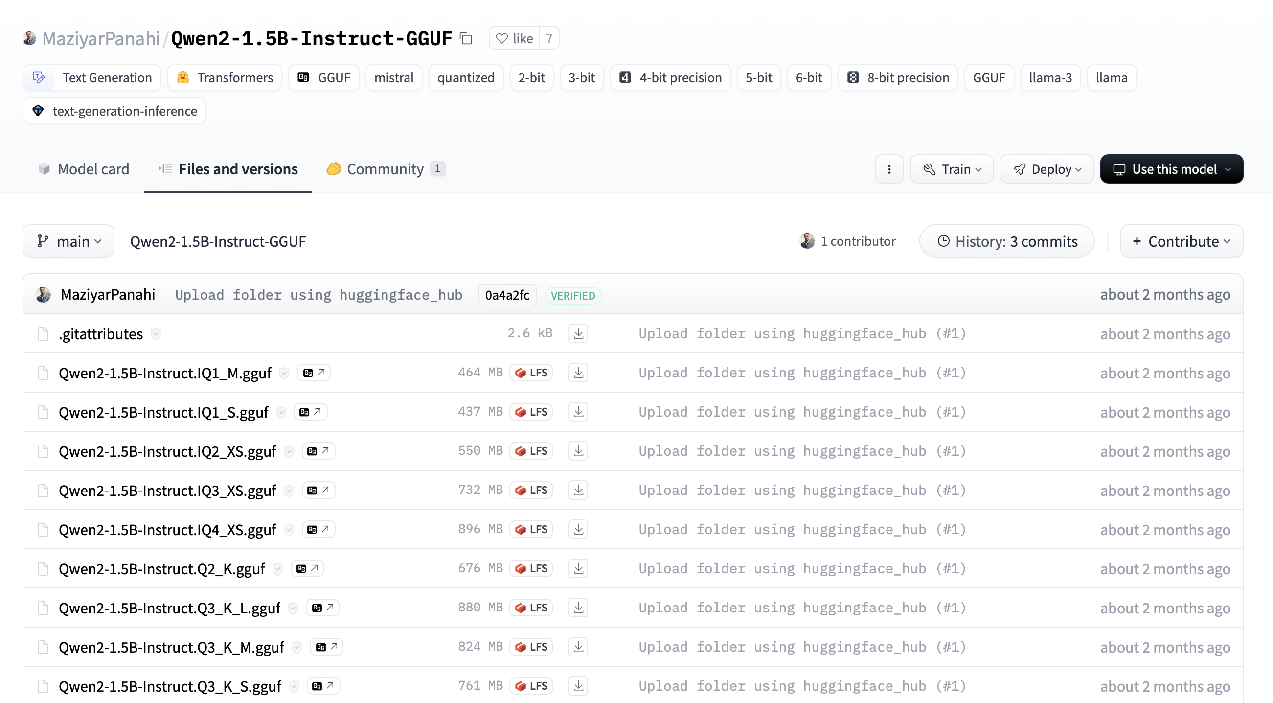 Huggingface에 가셔서 양자화된 모델들을 다운로드받습니다. 저는 qwen2-1_5b-instruct-q4_k_m.gguf 이 모델을 받았습니다.