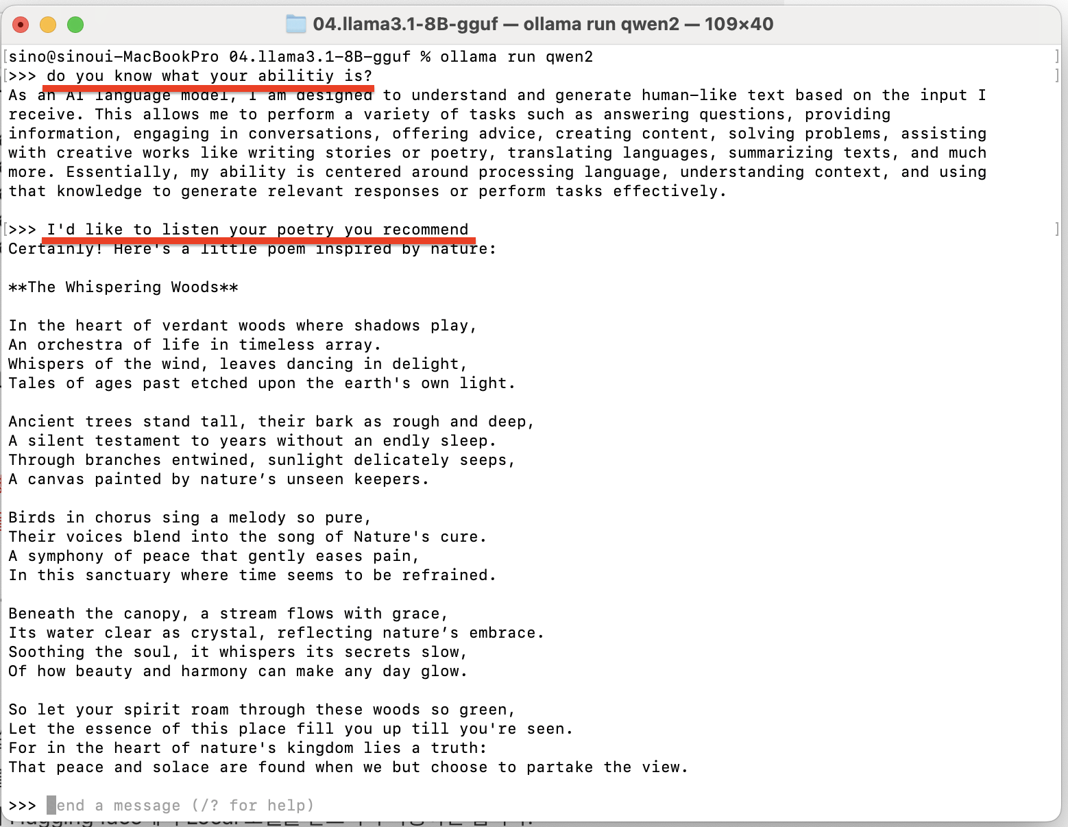 그래서 qwen2 모델을 다 설치하셨으면 ollama run qwen2를 입력하시면 바로 해당 모델을 사용할 수 있습니다.
