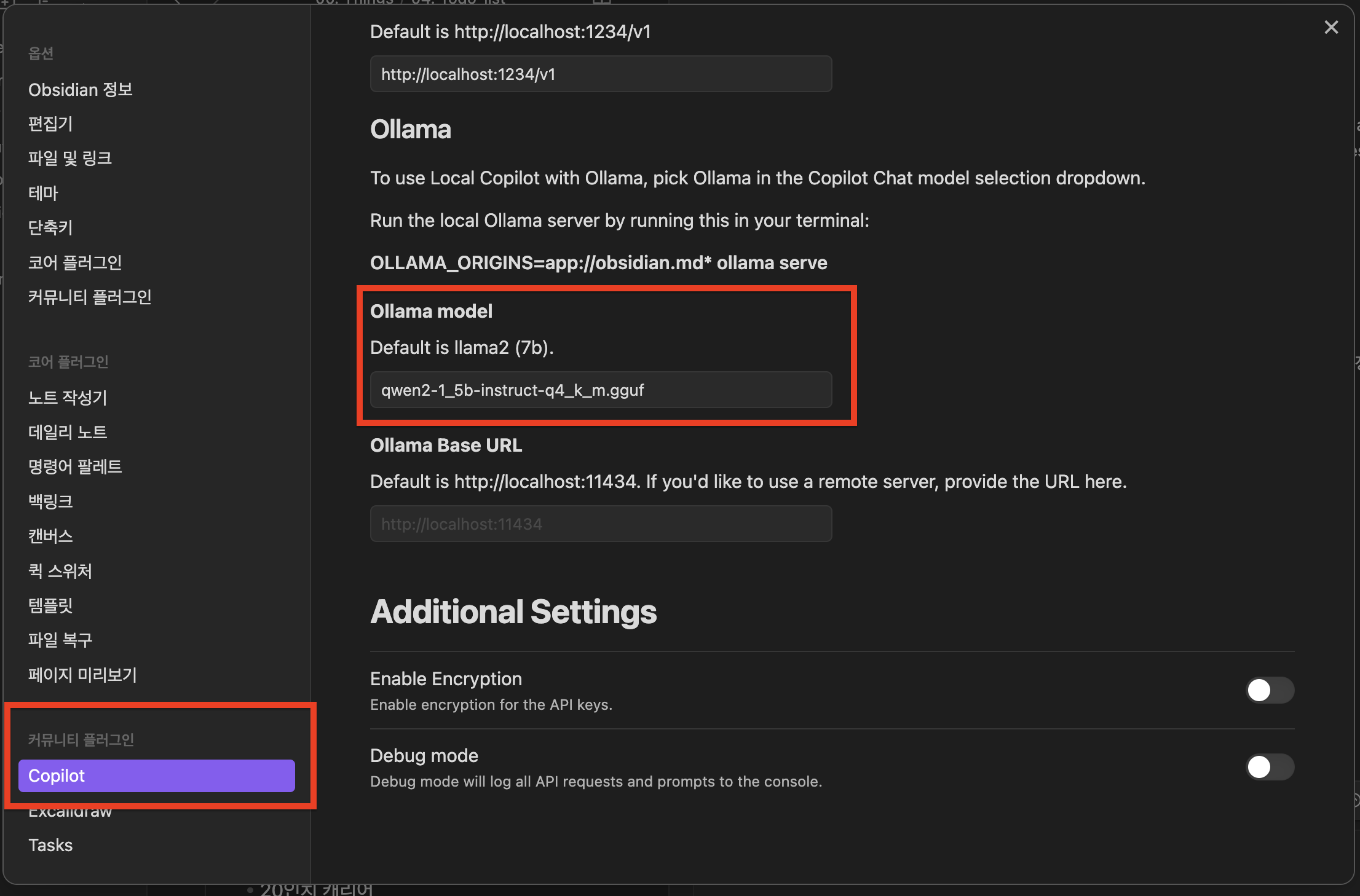 먼저 옵시디언 커뮤니티 플러그인에서 Copilot을 클릭하신다음에 Ollama 모델을 명시해주시구요.
