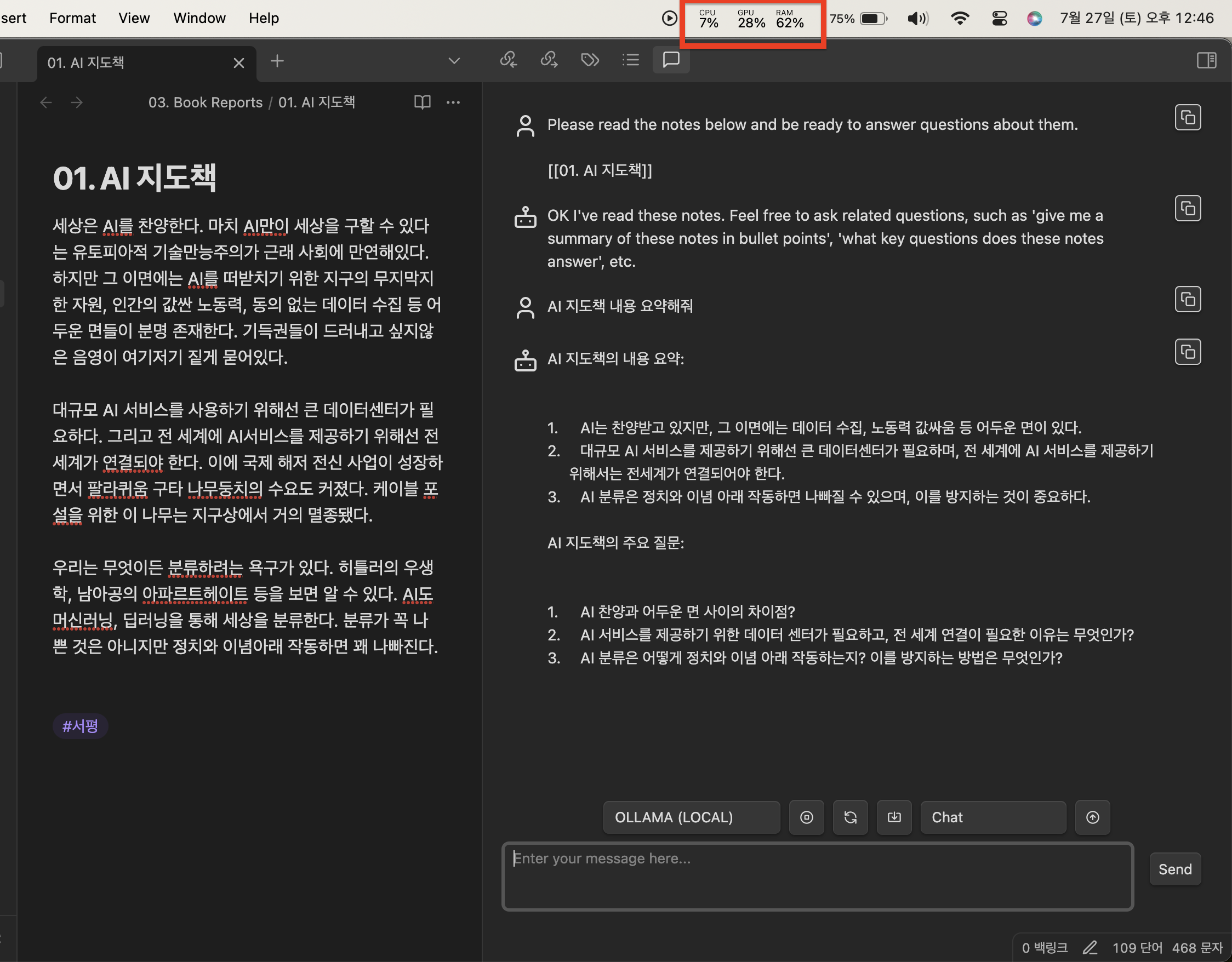 그림에서 보시는 것처럼 제가 작성한 AI지도책에 대해서 요약해달라고 요청을 하니 잘 정리해준 것을 확인할 수 있습니다.