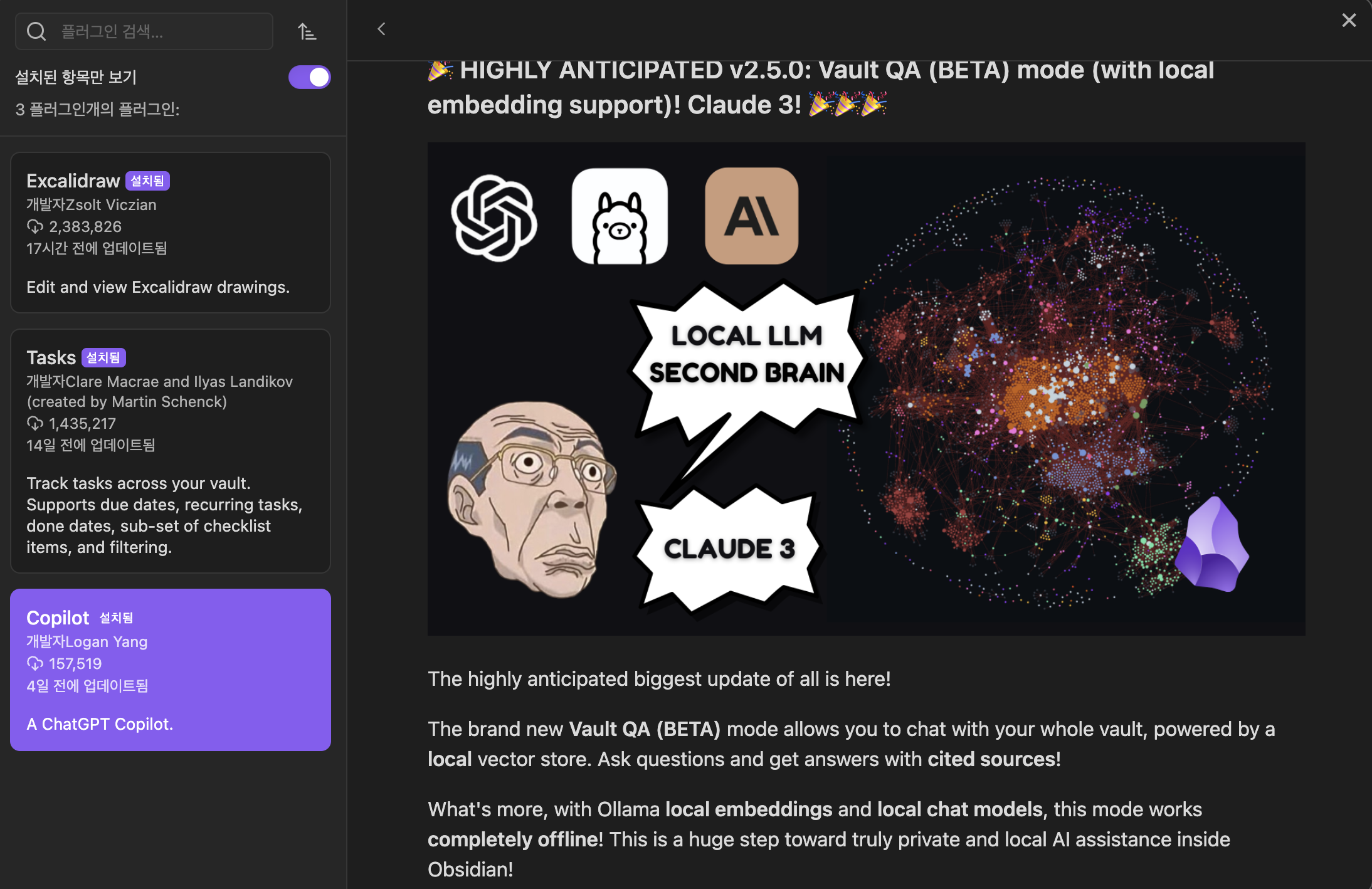 이번 시간은 저의 최애 노트앱 옵시디언에 LLM을 플러그인으로 연결하는 작업을 해봤습니다.