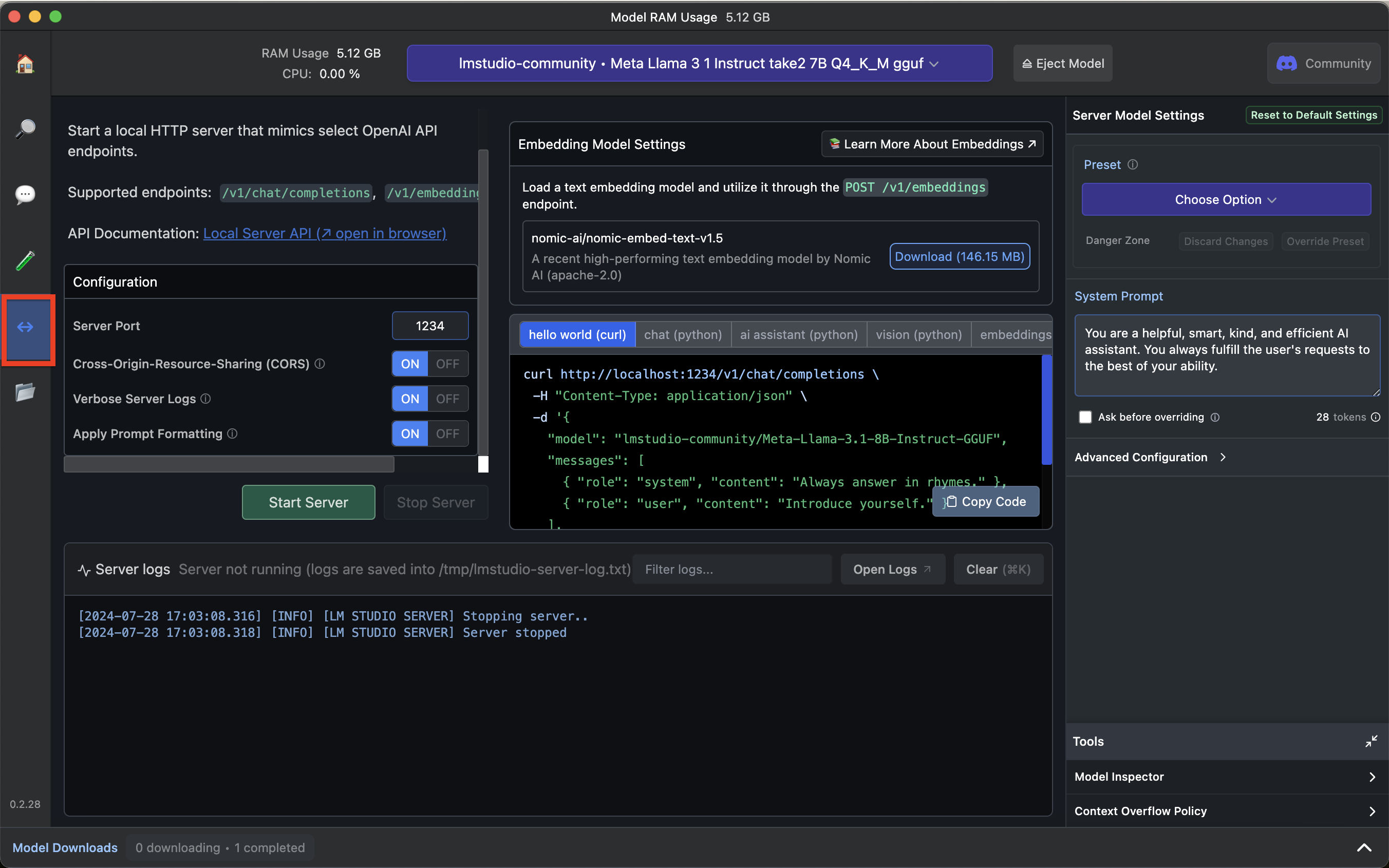 왼쪽 레드박스를 클릭하면 Local Server를 구동시킬 수 있는 화면이 나옵니다. 여기서 상단에 모델을 선택하면 자동으로 Curl안에 Model 명이 입력이 되네요. 그리고 Start Server를 누르면 서버가 구동됩니다. 이 상태에서 obsidian에서 copilot 플러그인을 다운로드 받아 LM studio를 클릭하여 copilot서비스를 사용하면 됩니다.