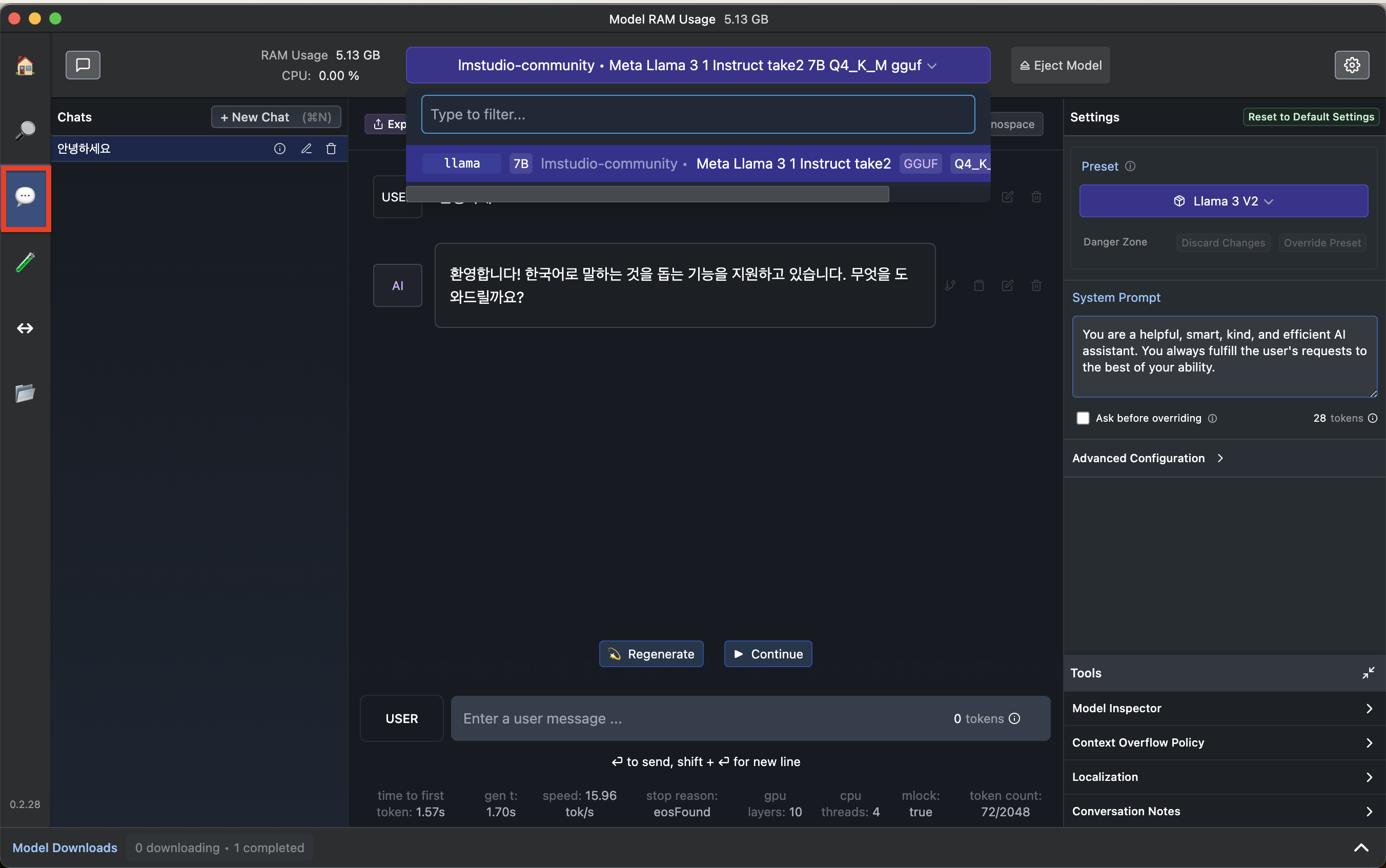 다운로드 받은 모델을 왼쪽 레드박스를 클릭하면 AI chat을 바로 사용할 수 있습니다.