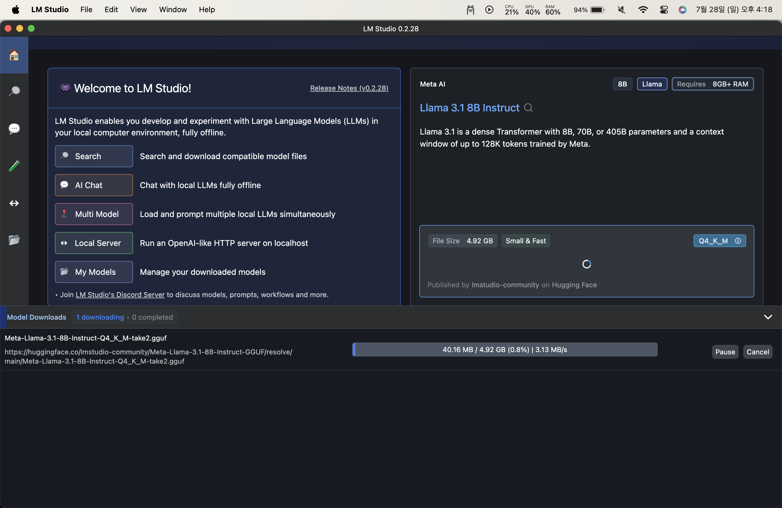 모델 다운로드부터 AI Chat, Local Server 구동 이 프로그램을 통해 모두 가능합니다.