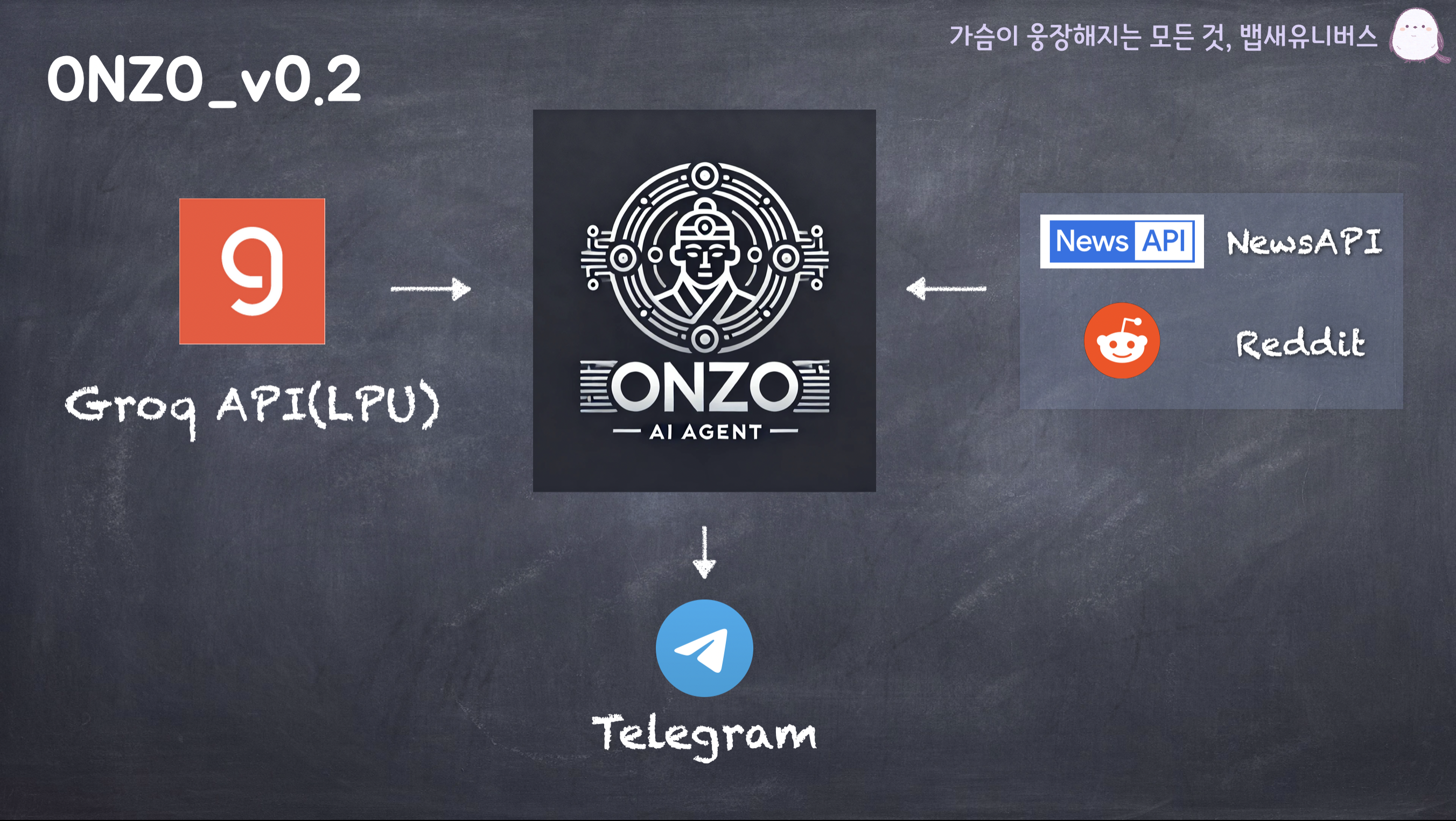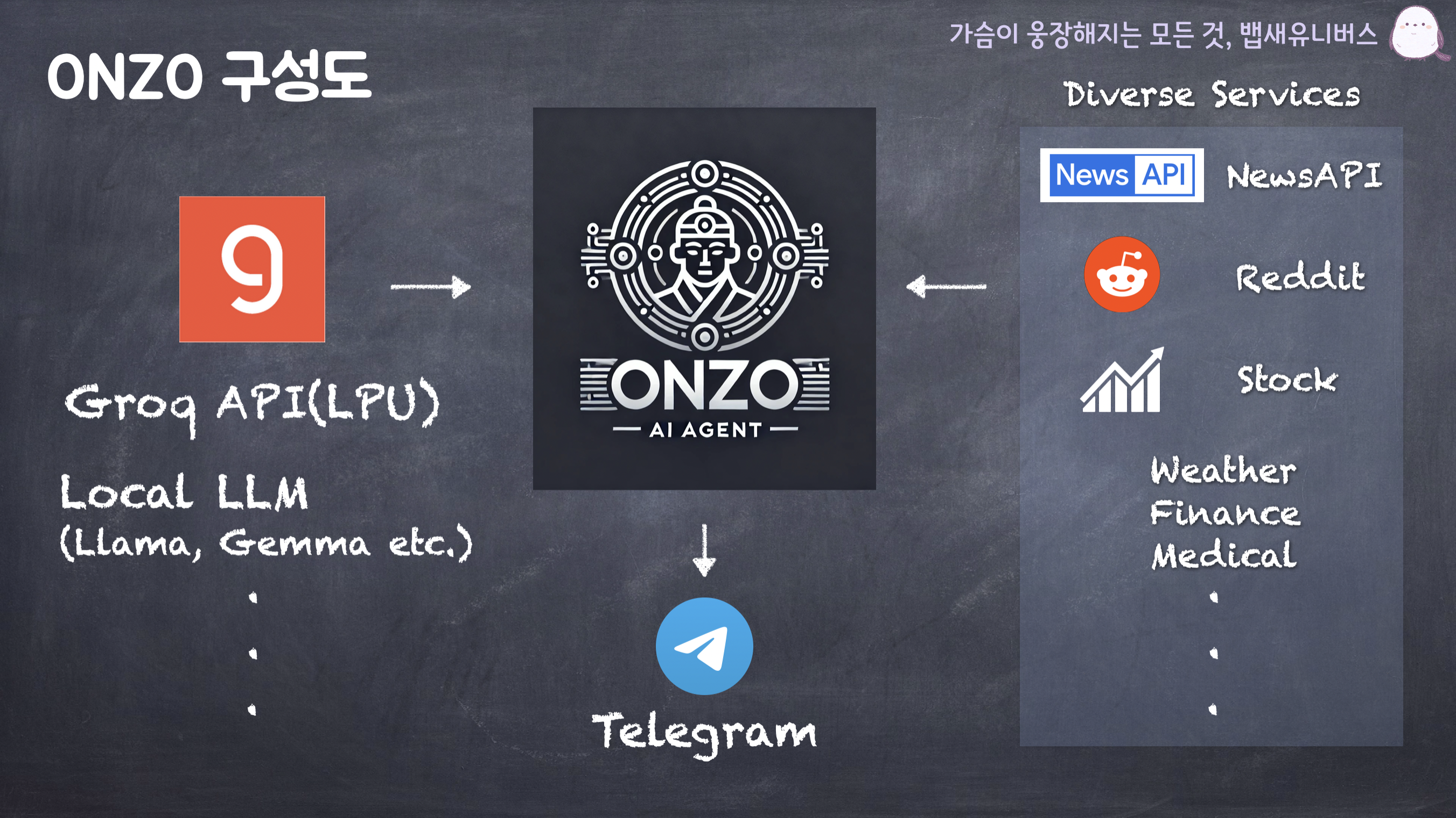 적은 자원으로 AI Agent를 구성하려고 했습니다. 그래서 Telegram 봇을 통해 소통하고, Groq(LPU라는 연산자원 + AI 모델 제공)을 사용해 LLM을 구성하고 다양한 API들을 연결하려고 합니다.