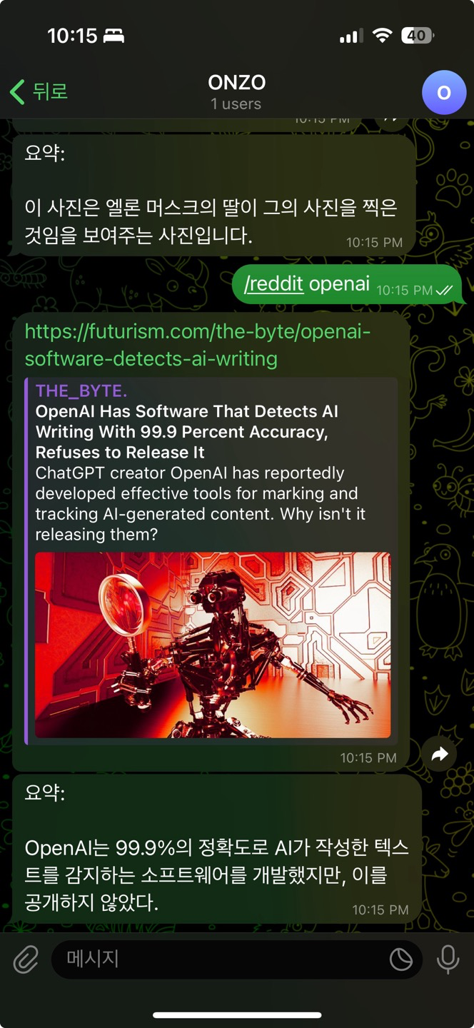 텔레그램봇은 무료로 텔레그램을 사용하고 봇토큰을 갖고 LLM과 통신할 수 있어서 구축했습니다.