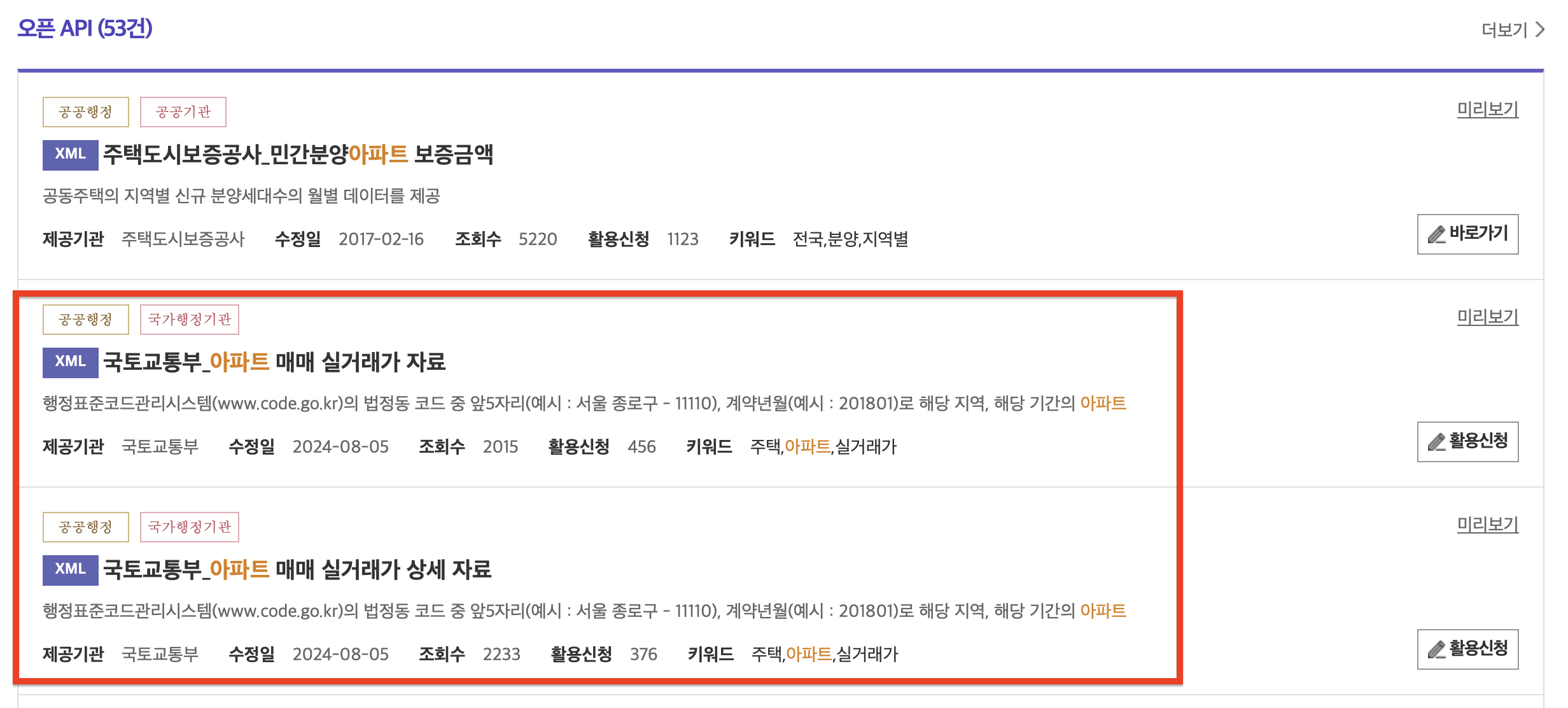 우리나라 아파트 실거래가를 불러올 수 있네요.