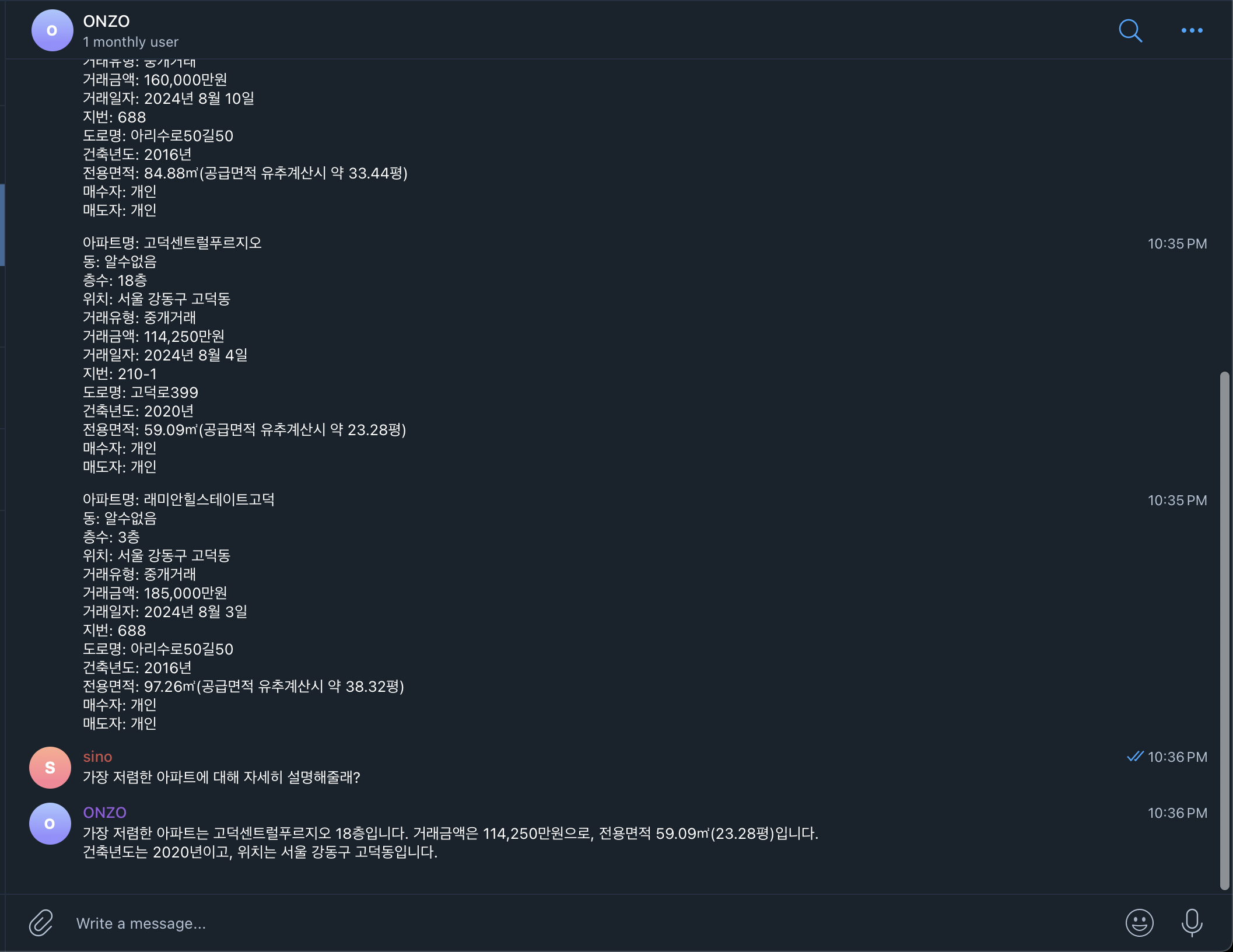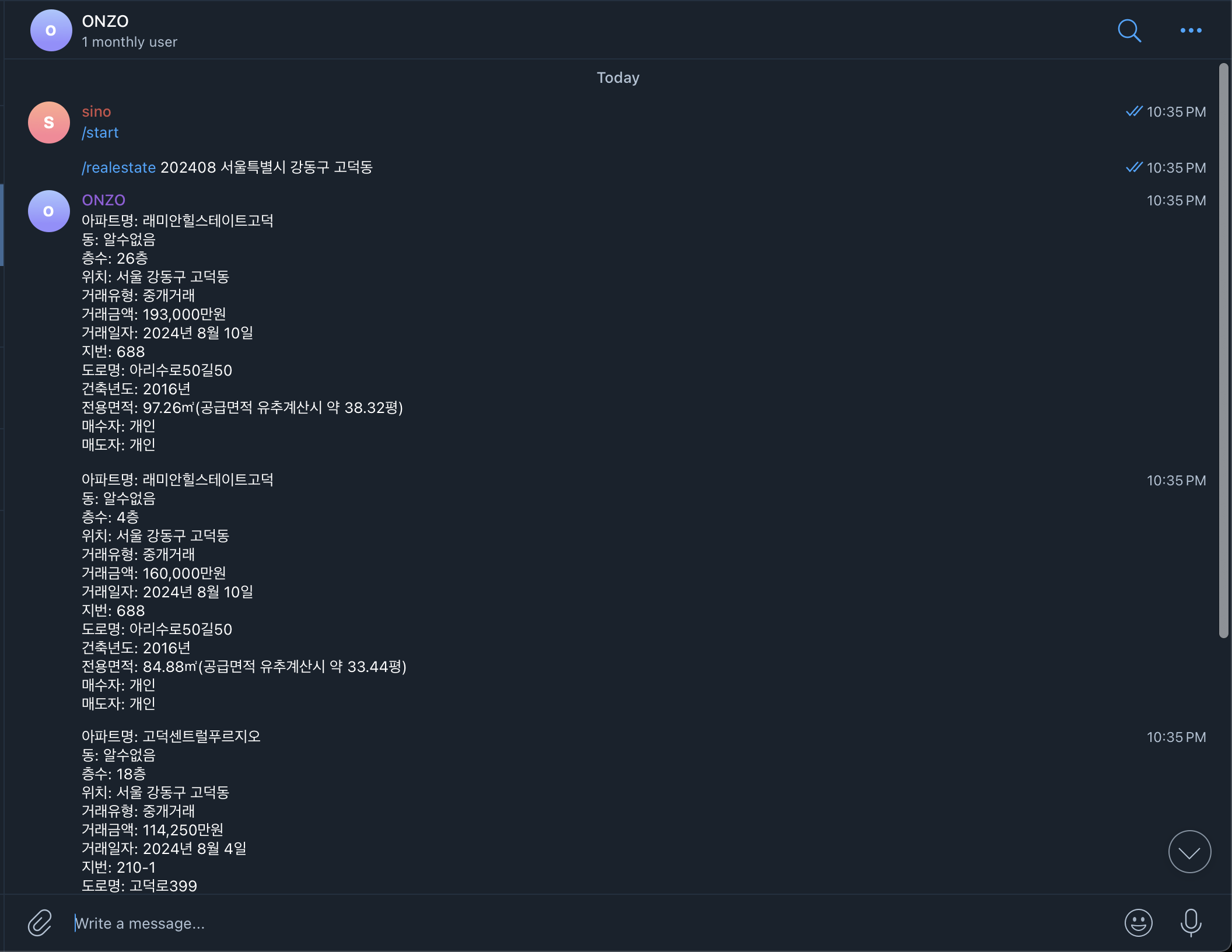 (1) 텔레그램으로 아파트 실거래가를 알려달라고 했다.