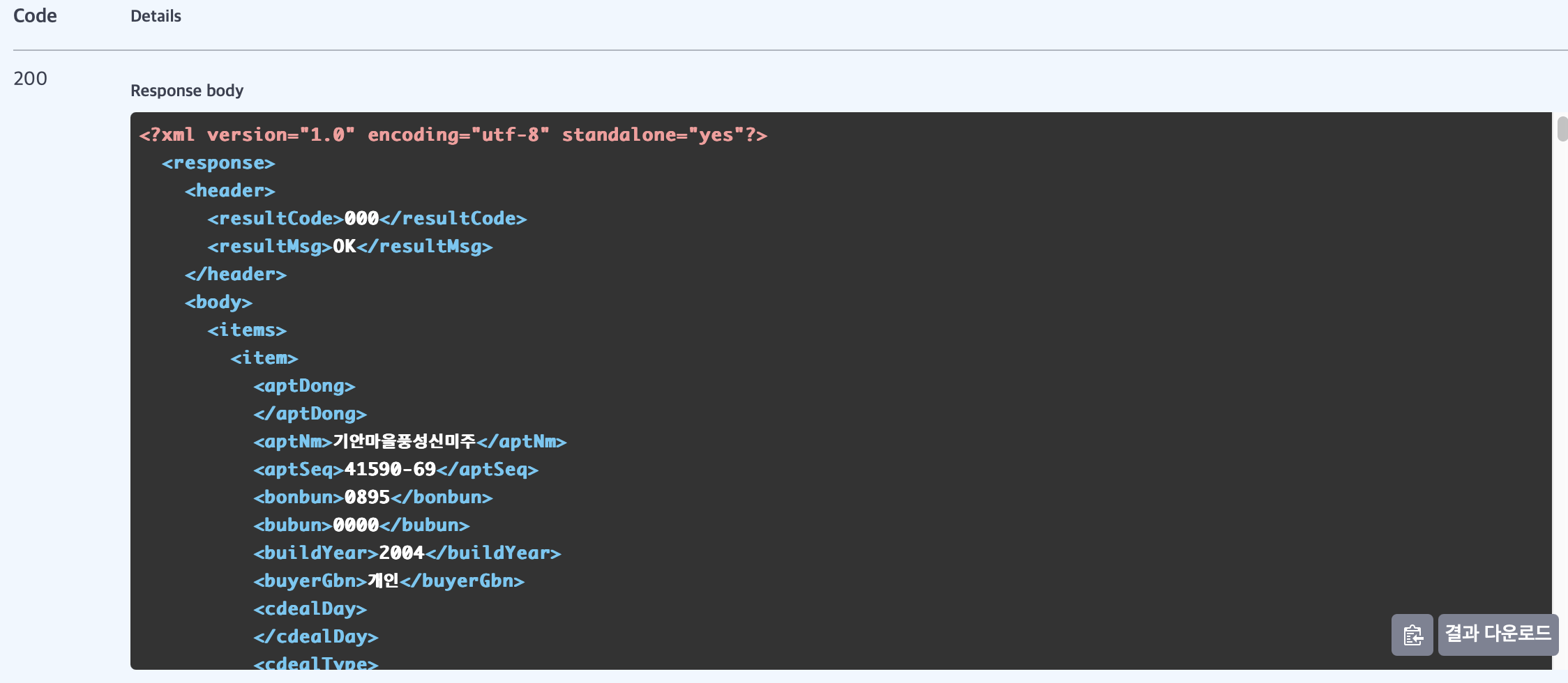 여기까지 오면 반은 왔습니다. 실거래가 상세정보를 테스트로 한번 request보내보겠습니다.