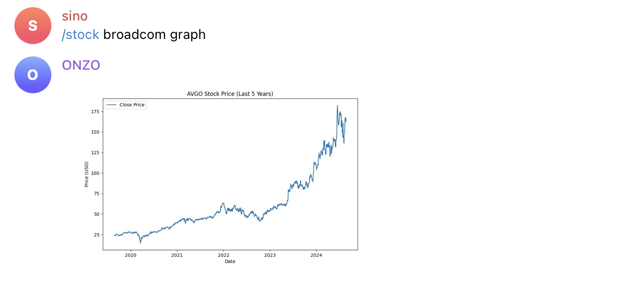 이렇게 입력하면 해당회사의 주식 정보를 불러옵니다. 저는 /stock broadcom을 입력했습니다.