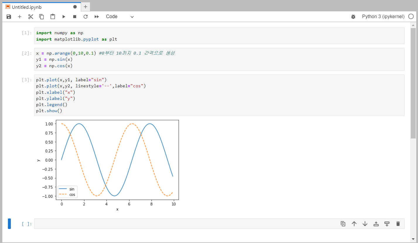 - plt.plot(x,y2, linestyle='--', label="cos")은 x와 y2 그래프를 그린 것입니다. label은 cos이라고 저장했습니다. linestyle은 점섬으로 표기하기 위해 '--'로 정의했습니다.