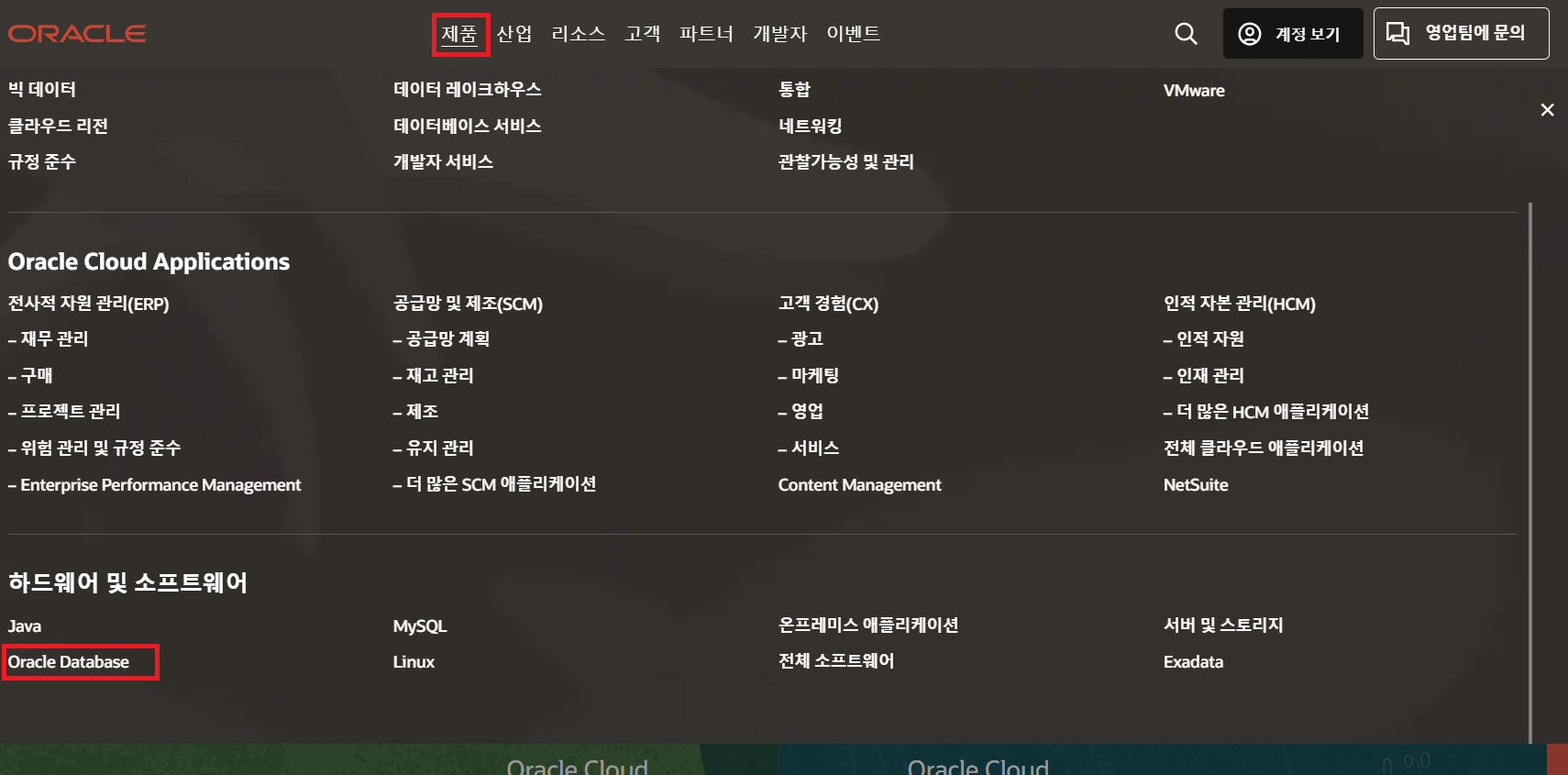 2. 제품 > 하드웨어 및 소프트웨어 > Oracle Database로 이동합니다.