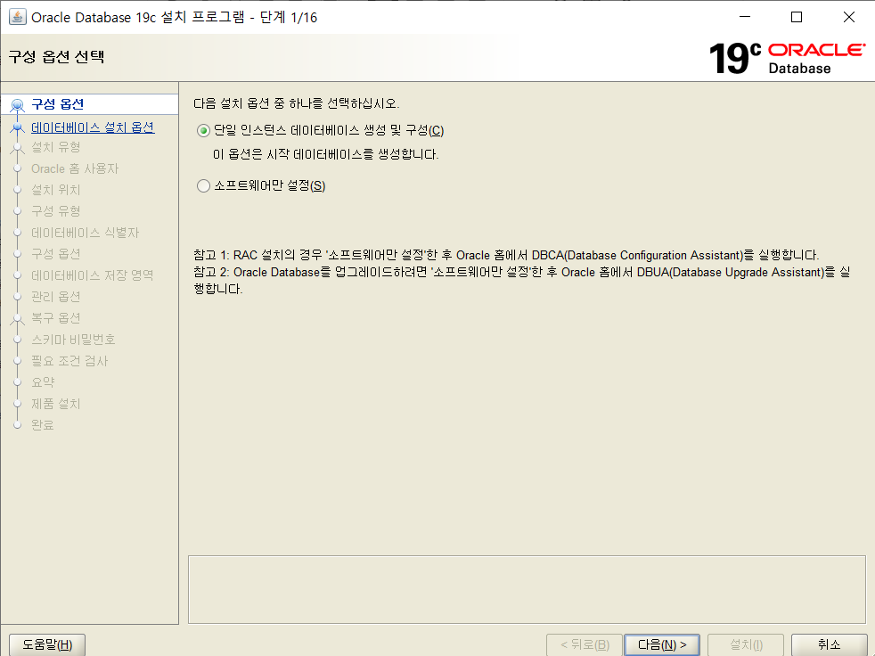 6. 구성 옵션을 선택합니다. DB를 생성하고자 할 때 단일 인스턴스 데이터베이스 생성 및 구성을 선택합니다.