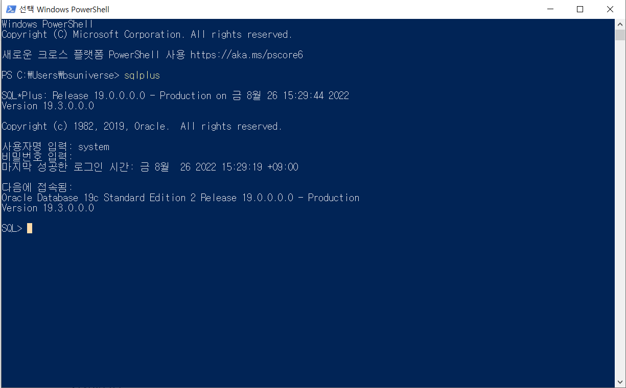 13. sqlplus가 실행되면 오라클 설치가 완료된 것입니다. win+R 키를 클릭하고 powershell을 입력한 다음 아래 그림과 같이 sqlplus를 입력하면 접속되는 것을 확인할 수 있습니다.