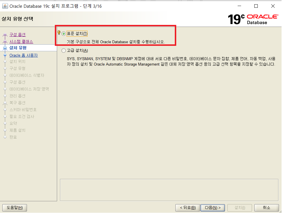 8. 원하는 구성에 따라 설치합니다. 저는 표준 설치를 했습니다.