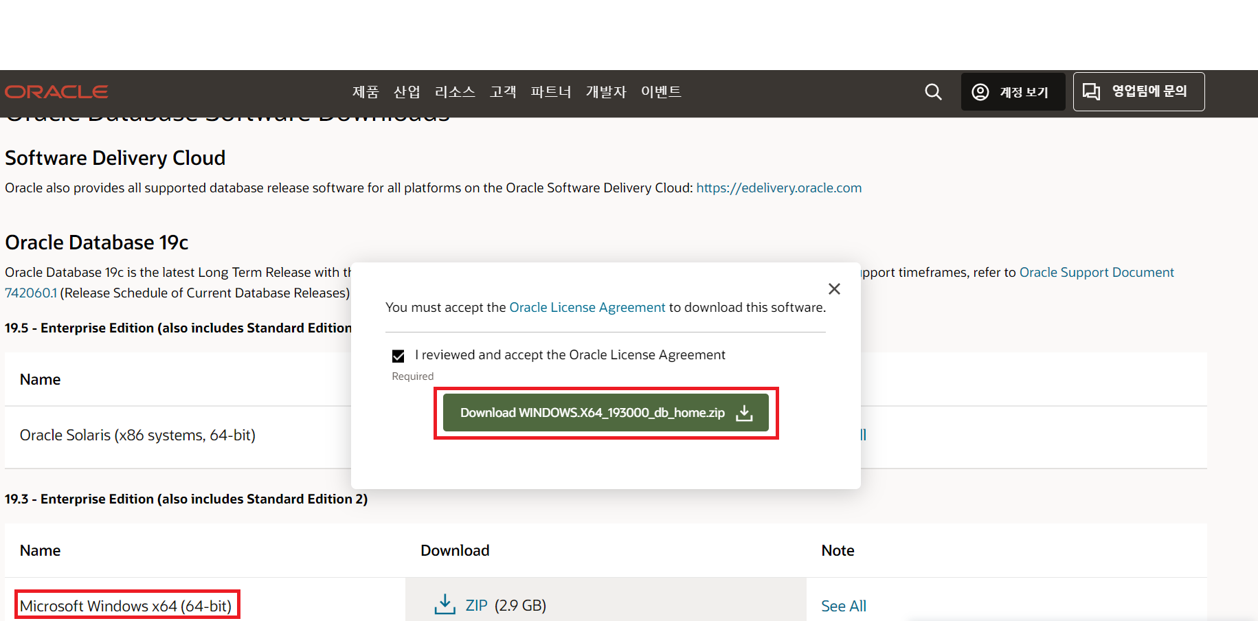 3. 아래 Oracle Database 19c 버전을 다운로드합니다.