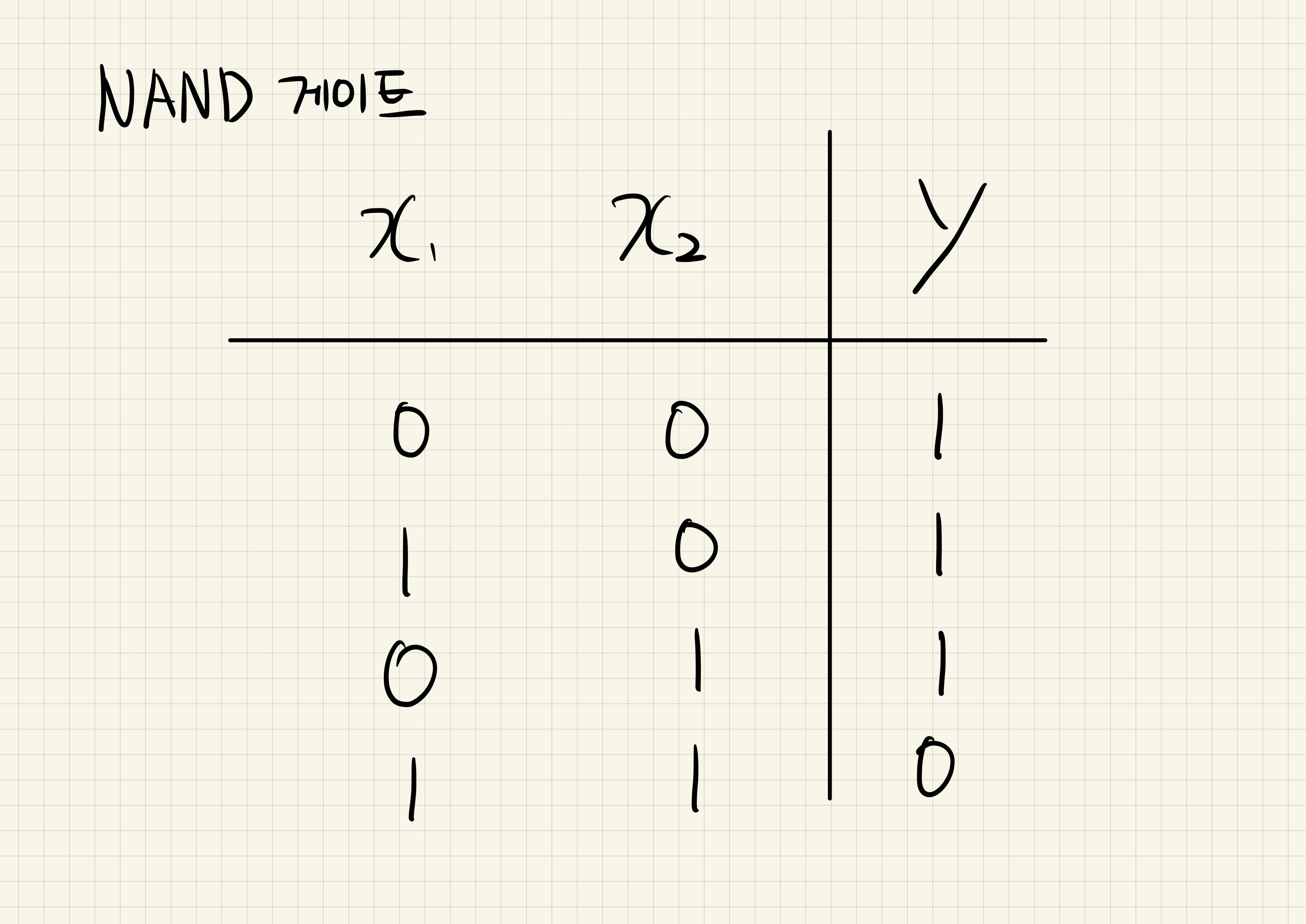 2. NAND 게이트 : AND게이트와 반대입니다. AND의 출력과 반대인 것이죠. X1, X2가 1일 때 Y는 0을 출력하고, 그 외는 모두 Y가 1을 출력합니다.