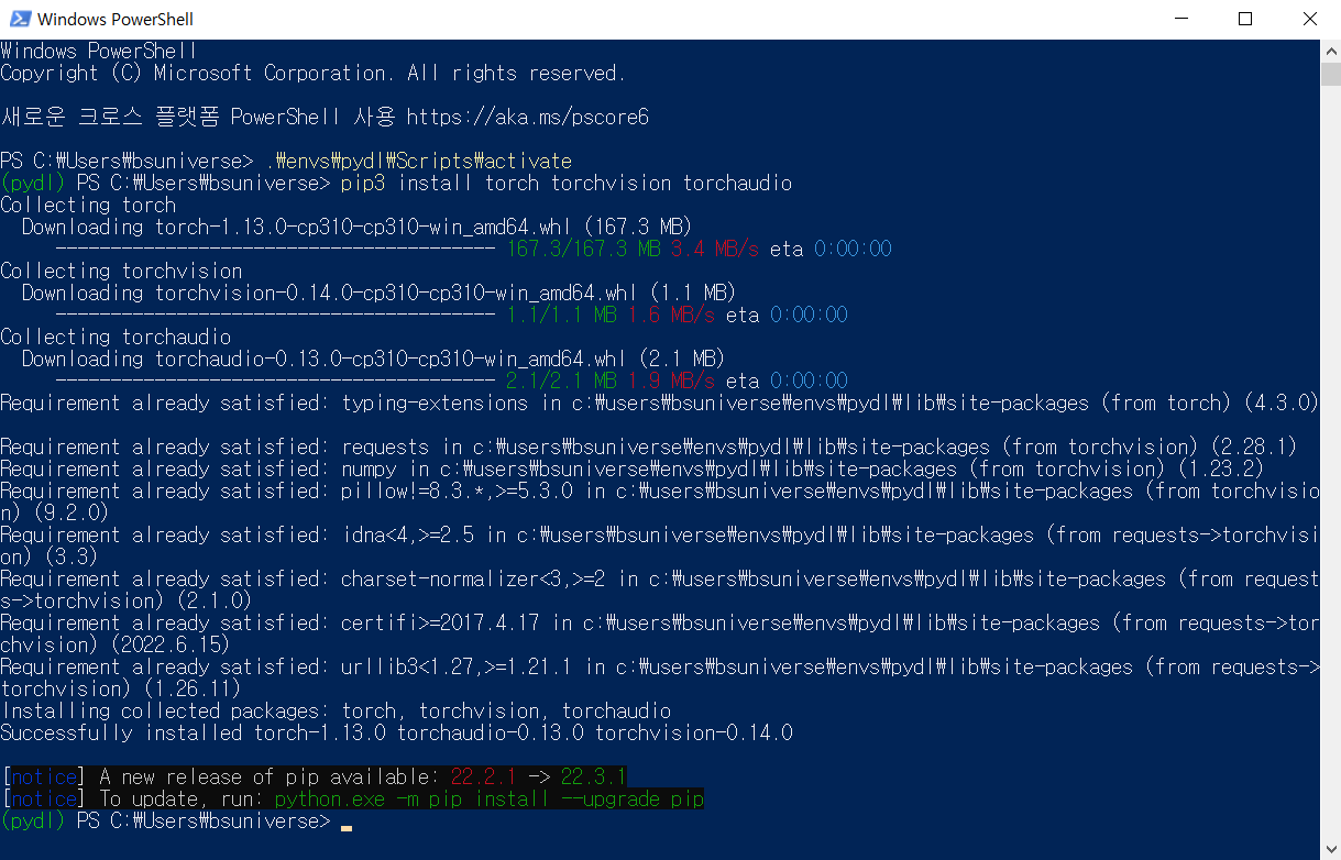 시작하기에 앞서 torch를 설치합니다. torch는 오픈 소스 머닝러신 라이브러리입니다. torchvision(Dataset정의, 모델 아키텍쳐, 컴퓨터 비전을 위한 이미지 변환)과 torchaudio(audio processing library)는 그 안에 있는 패키지로 보시면 됩니다.