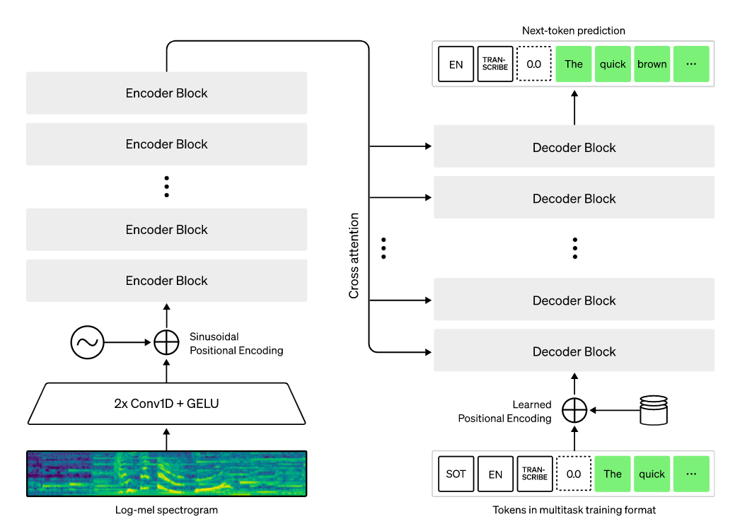 Input audio가 입력되면 Log-mel spectrogram 안에 들어가서 Encoder를 지나 Decoder에서 일치하는 text를 찾기 위해 훈련한다고 합니다. 자세한 내용은 open AI paper를 참조하시길 바랍니다.