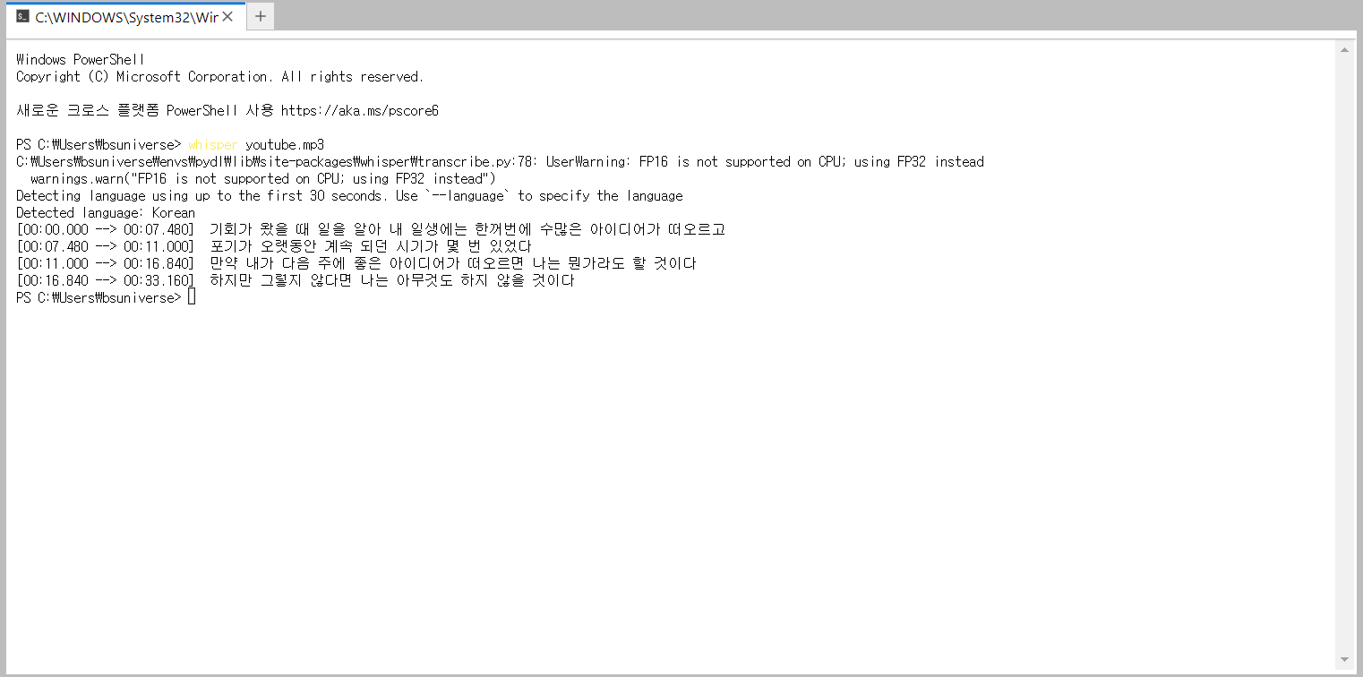 jupyter notebook에서 terminal에 들어가 whisper 명령어를 치니 Detecting language using up to the first 30 seconds라는 문구가 나오고 mp3파일을 분석해 감지된 언어가 한국어로 나오고 아래와 같이 인식한 음성을 텍스트로 변환해주었습니다.
