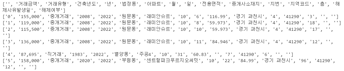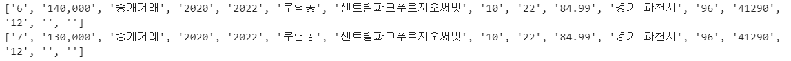writer.writerow(['6', '140,000', '중개거래', '2020', '2022', '부림동', '센트럴파크푸르지오써밋', '10', '22', '84.99', '경기 과천시', '96', '41290', '12', '', ''])