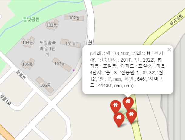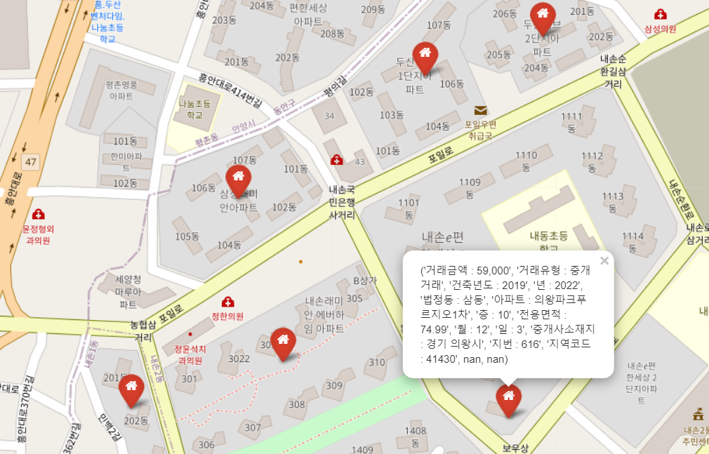 이외에도 html을 별도로 생성하지 않고 윈도우 작업 스케줄러(배치)를 만들어서 주기적으로 공공데이터포털로부터 데이터를 받아올 수 있습니다. folium에 bar chart, line graph 표기를 통해 아파트별 거래금액도 그래프로 보여줄 수 있구요!