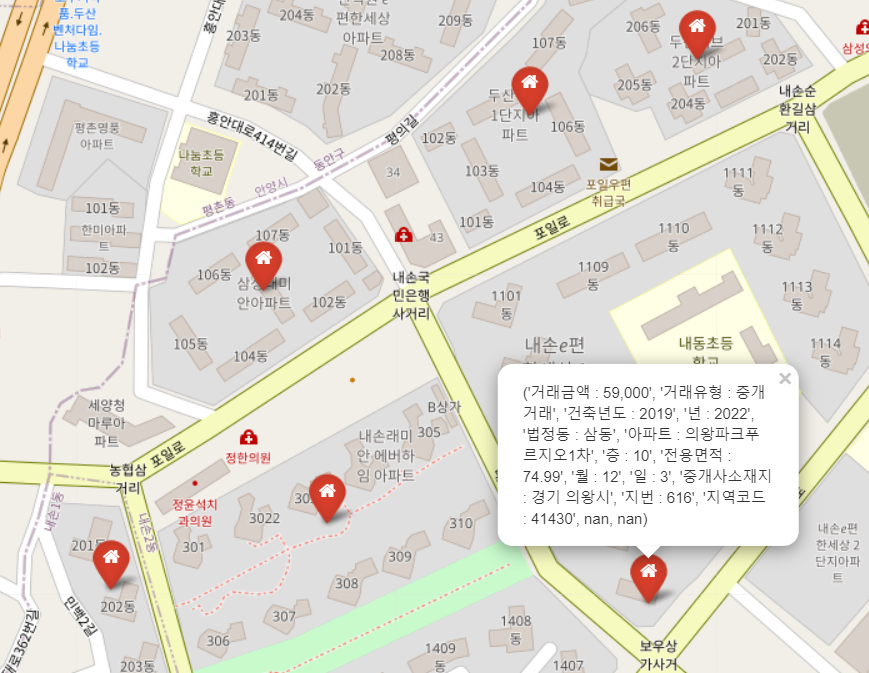 요즘 핫한 경기도 의왕시 아파트 부동산 실거래가 위도 경도 표기 맵핑 아파트 실거래가 보여주기 python folium