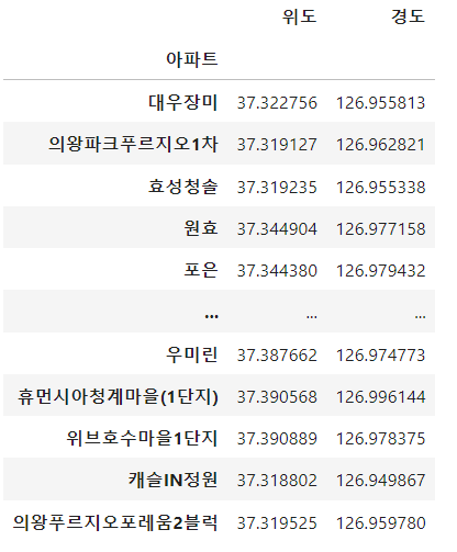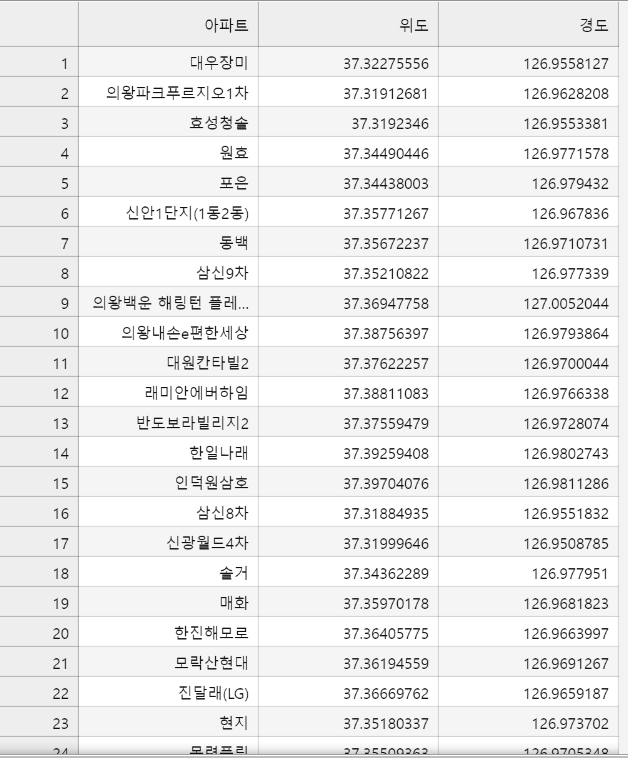 생각보다 오래걸렸습니다. 아파트별 위경도값에 결과가 아래와 같이 나옵니다.