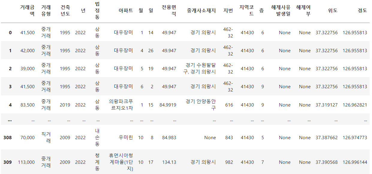 ###2022년 1월부터 12월까지 경기도 의왕시 부동산 실거래가를 dataframe으로 표현한다.###