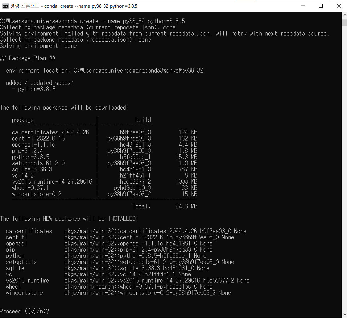 그러면 진행하시겠습니까? proceed y/n이 출력되고 y를 입력하면 가상환경이 만들어집니다.