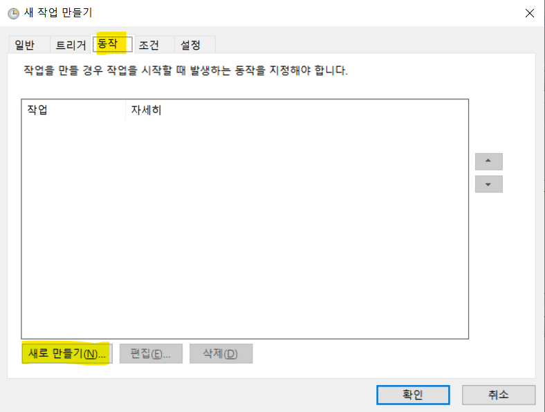 그 다음 동작 탭을 누르고 새로 만들기 버튼을 클릭합니다.