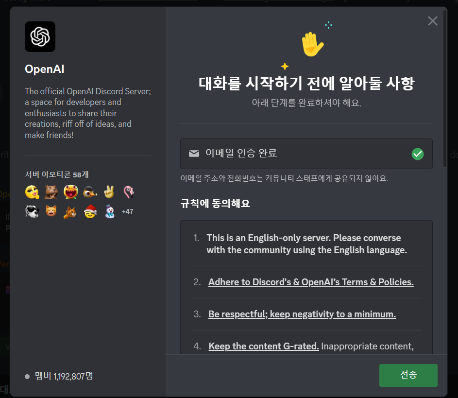 openAI discord를 사용하려면 규칙에 동의해야해요.