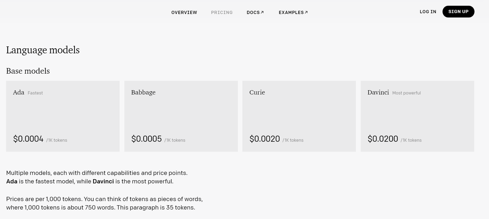 1k tokens 기준 ada가 가장 저렴하고 Davinci가 가장 비쌉니다.