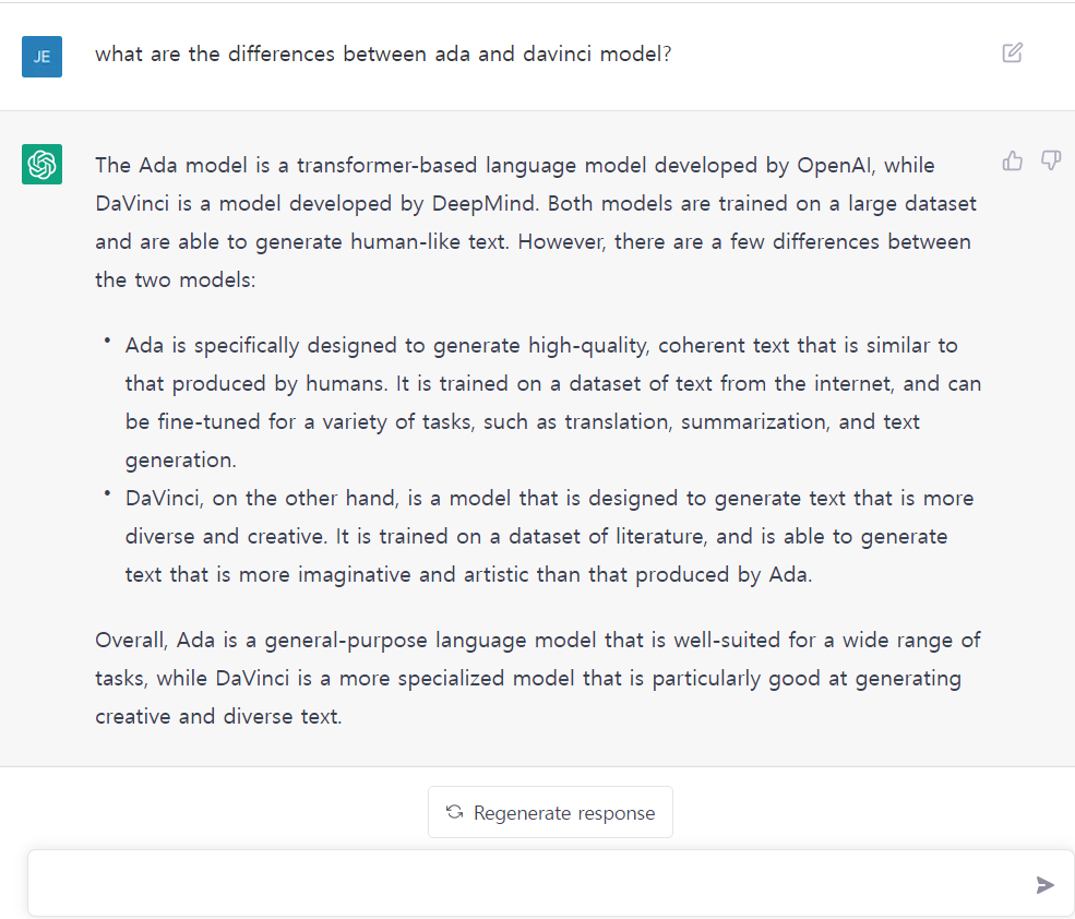 다빈치는 보다 imaginative 하고 artistic한 deepMind에서 학습한 AI이고, Ada 는 openAI에 의해 개발된 다양한 task를 수행할 수 있는 ai 학습모델입니다.