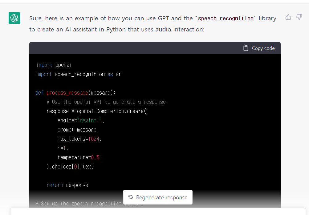 파이썬으로 AI 비서 만들어줘!라고 해봤습니다. gpt를 이용해서 AI비서를 만들어달라고 하니 방법을 상세히 알려줍니다.