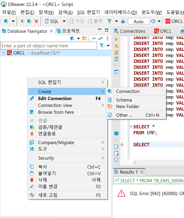 설치하고 나면 아래와 같이 Database Navigator에서 마우스 오른쪽 클릭을 하면 Create가 보입니다.