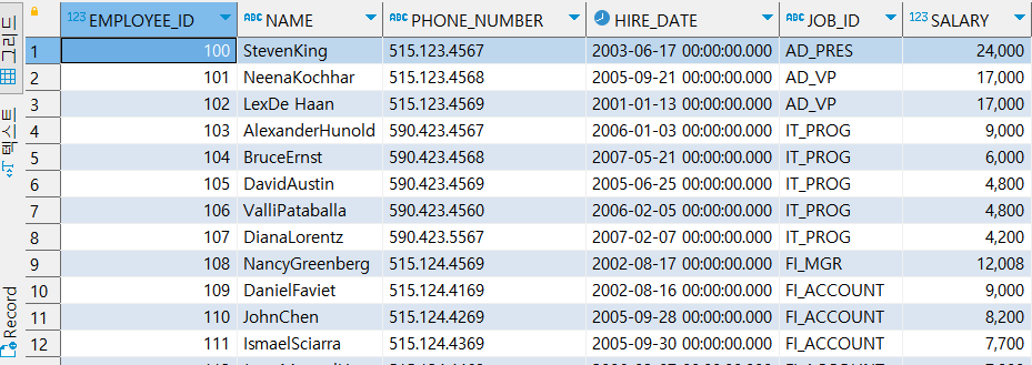 사원테이블에 FIRST_NAME과 LAST_NAME이 별도로 구분되어 있습니다. 이를 하나의 컬럼으로 SELECT 하고 싶을 때 CONCAT과 같은 문자열합치기 함수를 사용합니다.