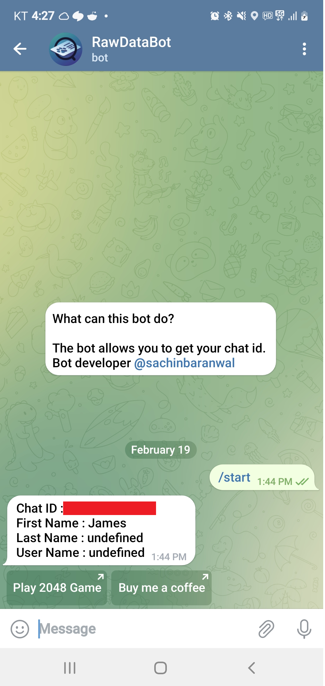 ② TELEGRAM_USER_ID : 두번째는 TELEGRAM_USER_ID값입니다. 같은 방식으로 botfather대신 rawdatabot을 텔레그램 상단 search에 입력합니다. RawDataBot에 들어가 /start를 치면 ChatID를 줍니다. 이게 TELEGRAM_USER_ID로 들어갈 값입니다.