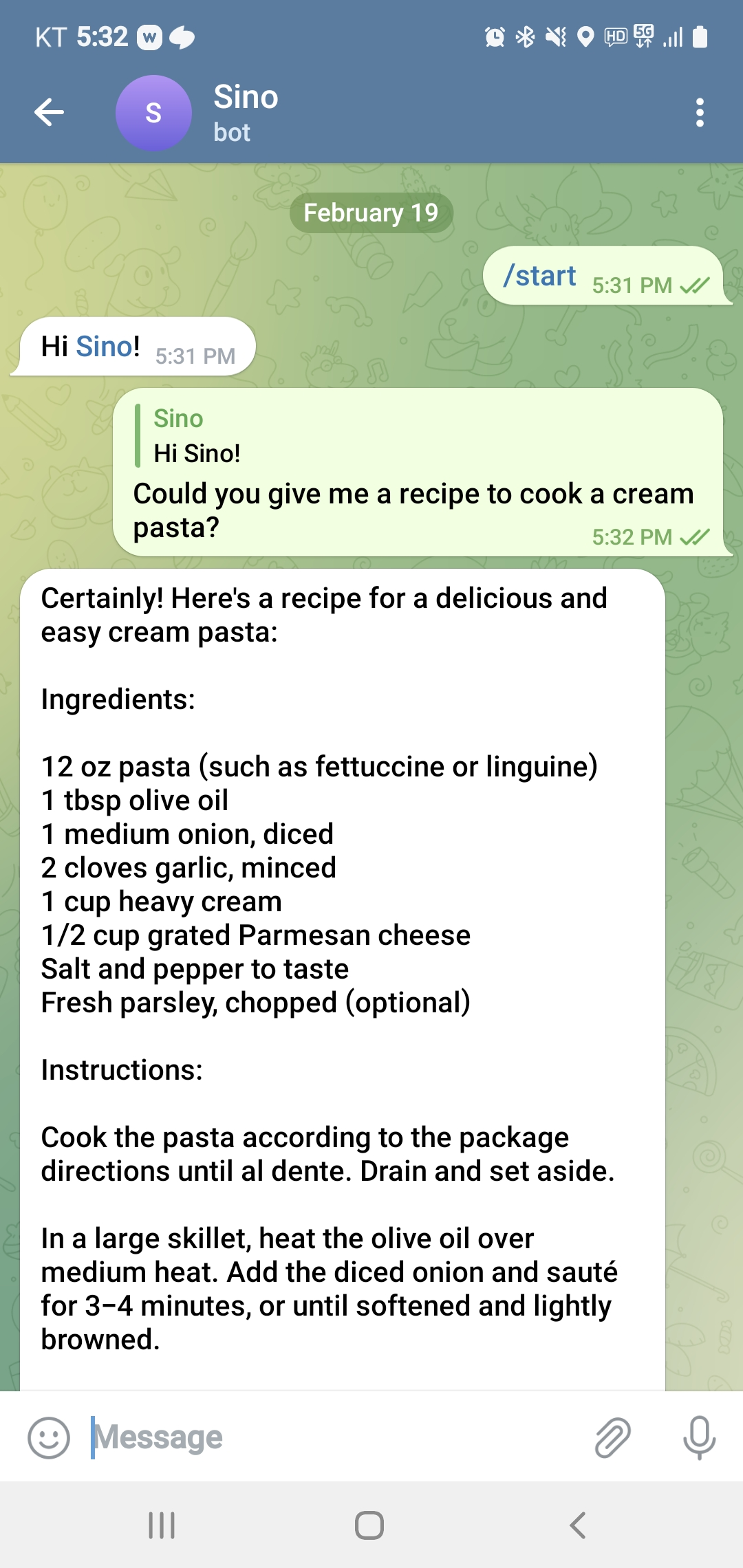그리고 텔레그램에 있는 제봇에 크림파스타 만드는 법을 물어보니 잘 알려주는 것을 확인할 수 있습니다~!