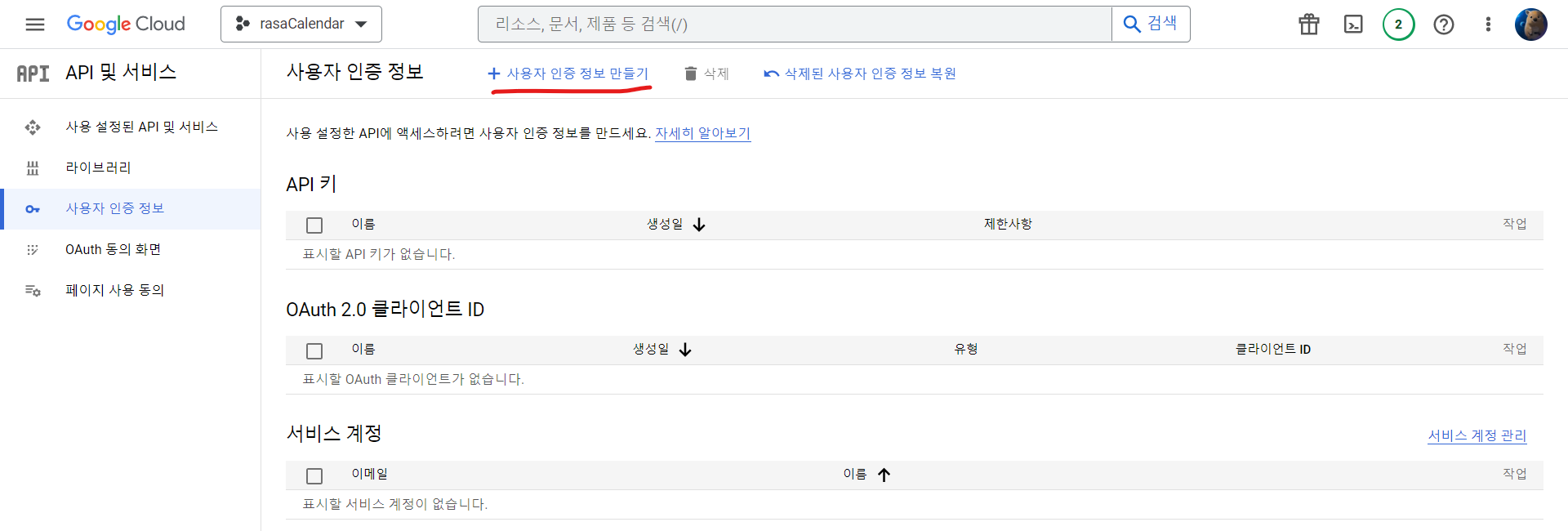 왼쪽 메뉴에서 사용자 인증정보에 들어가 사용자 인증정보 만들기를 클릭합니다.