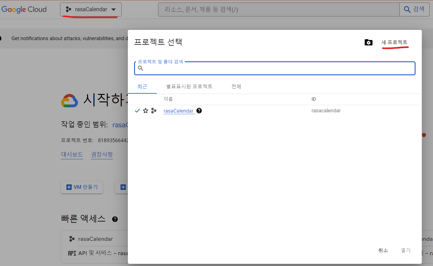 Google Cloud에서 본인 ID로 접속하면 상단에 프로젝트를 선택할 수 있습니다. 그러면 아래와 같이 프로젝트 선택팝업이 뜨는데 새프로젝트를 클릭해 본인이 원하는 이름으로 만듭니다.