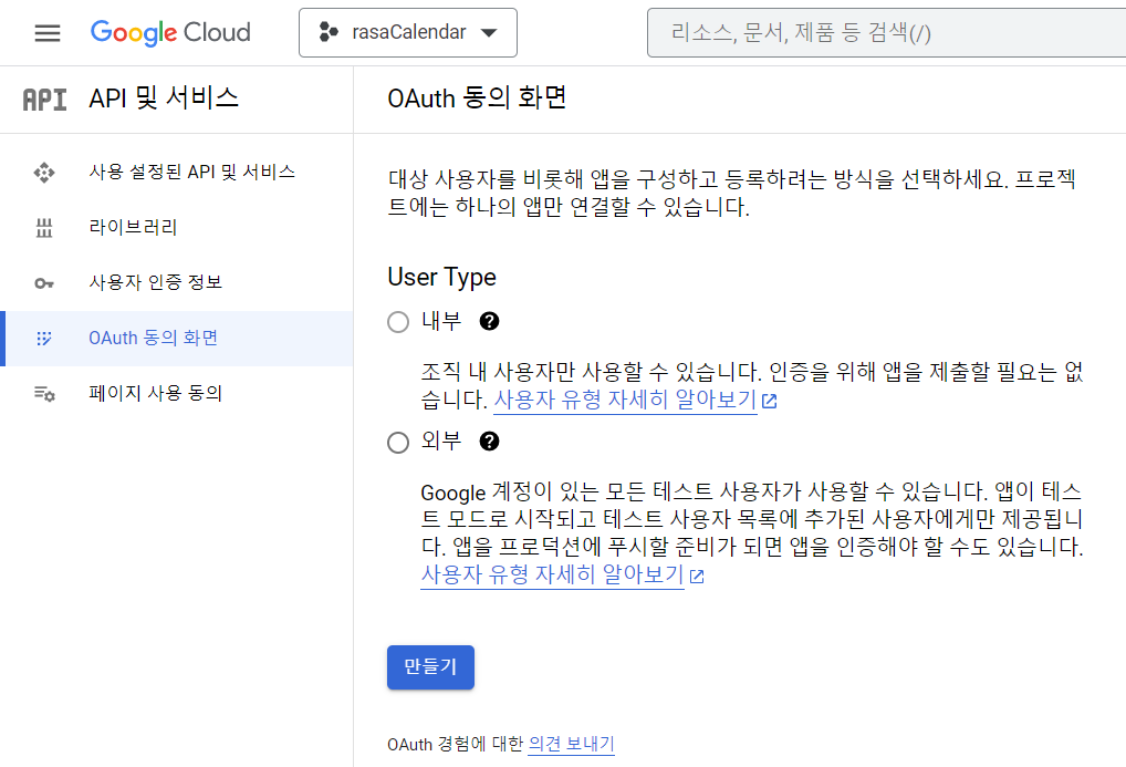 왼쪽 메뉴에서 OAuth 동의 화면으로 이동합니다.