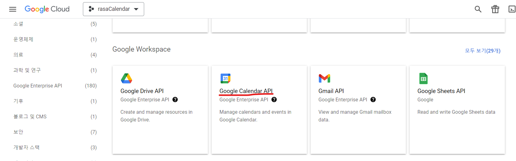 조금만 내리면 Google Workspace에 Google Calendar API를 찾을 수 있습니다.