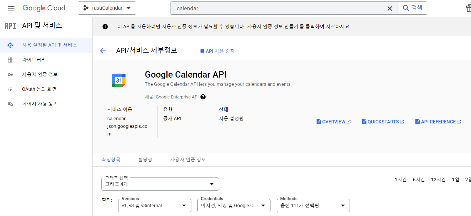 그러면 API 및 서비스 화면으로 다시 돌아와 Google Calendar API가 사용상태인 것을 확인할 수 있죠.