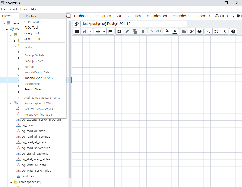 왼쪽 메뉴 상단에 ERD Tool과 Query Tool 등이 있는 것을 확인할 수 있습니다.