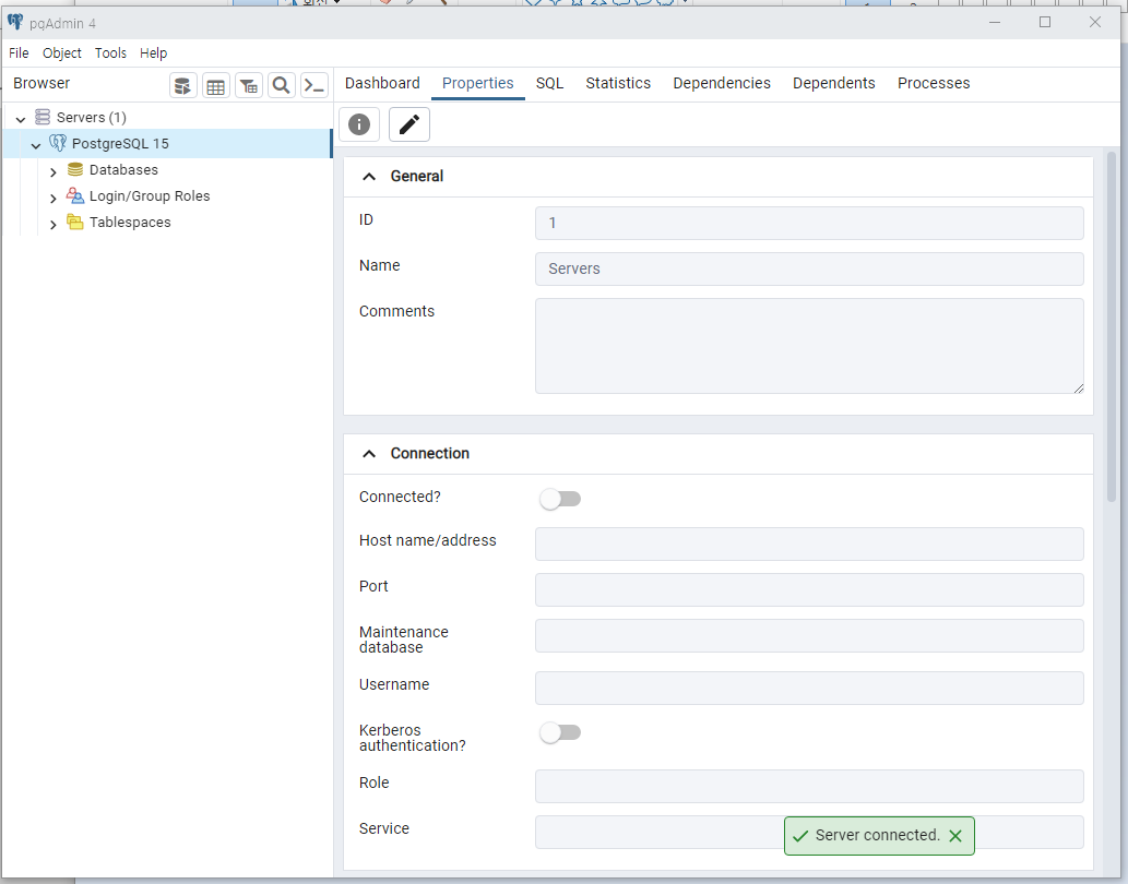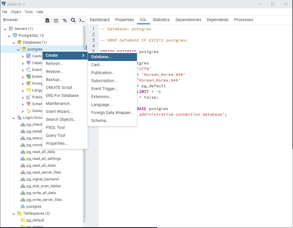 데이터베이스 서버는 크게 3가지로 구성되어있습니다. 테이블을 생성할 수 있는 Databases와 DB 로그인 계정을 관리하는 Login/Group Roles, 테이블들의 저장공간, 딕셔너리 파일들을 관리하는 Tablespaces가 있습니다.