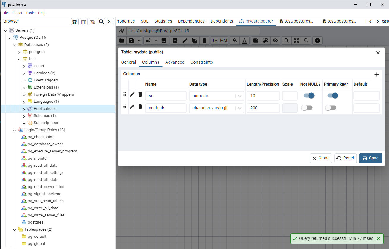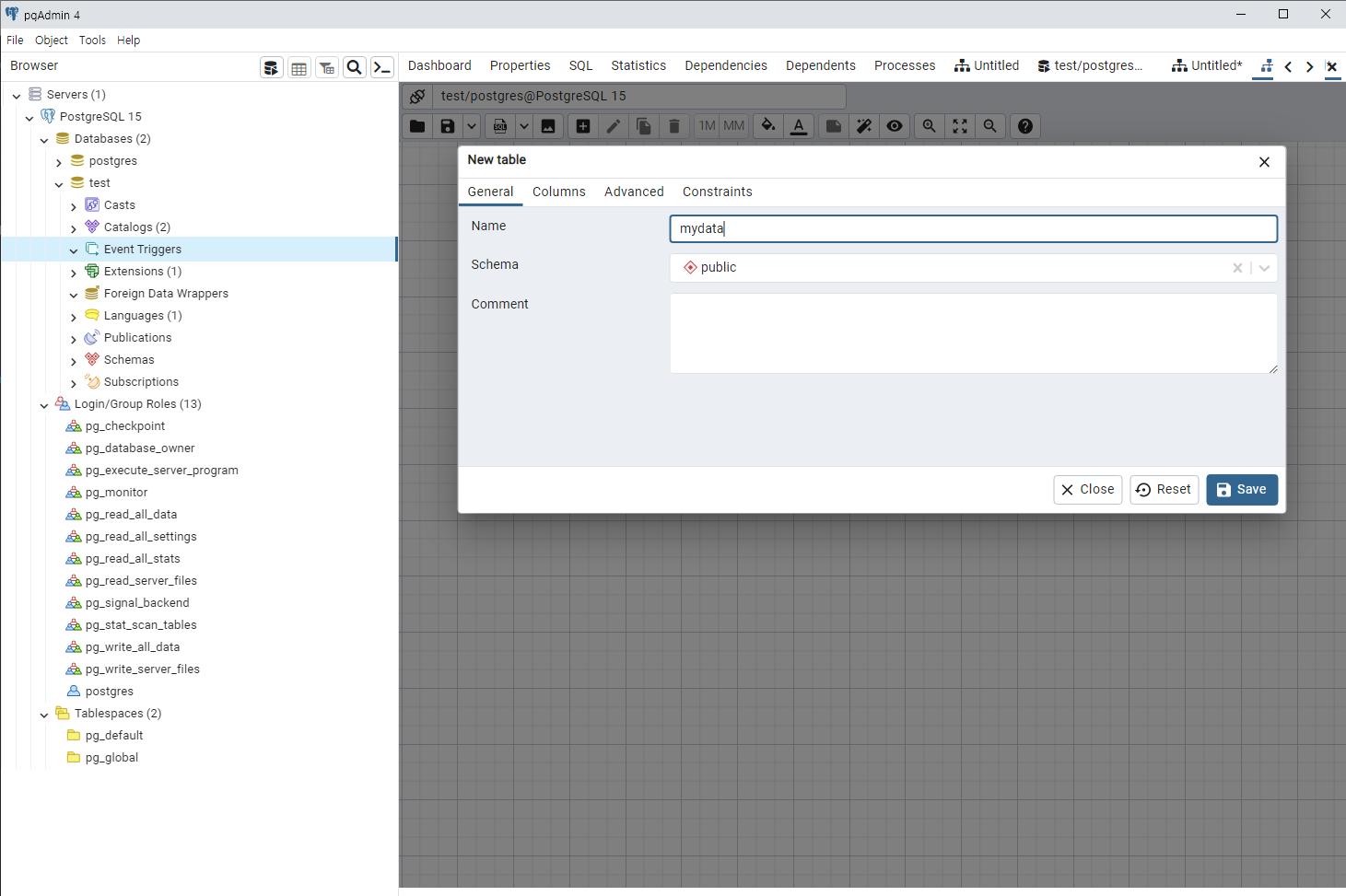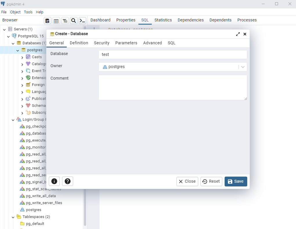 Database 명을 test로 하고 owner는 기본인 postgres로 설정합니다. 해당 DB의 Owner를 바꾸고 싶으시면 Login/Group Roles에서 별도로 계정을 생성해줍니다.