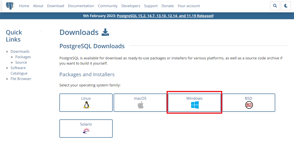 Download PostgreSQL로 이동하면 아래와 같이 15.2버전(23.03.06기준)이 최신버전이고 Windows x86-64에 있는 버튼을 클릭해서 다운로드 받아줍니다.